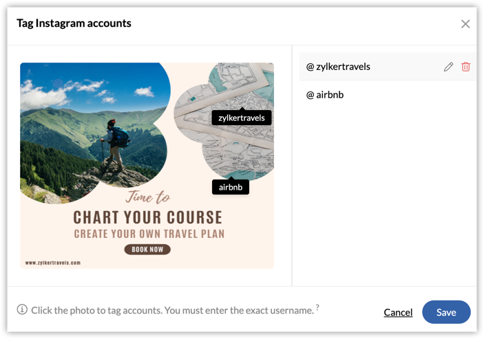 Yes, you can tag profiles on images on Instagram and add a location to your posts on Facebook and Instagram. To tag accounts in an image: Click Tag Accounts in the compose window once you've attached the required images for the post. Click anywhere ...