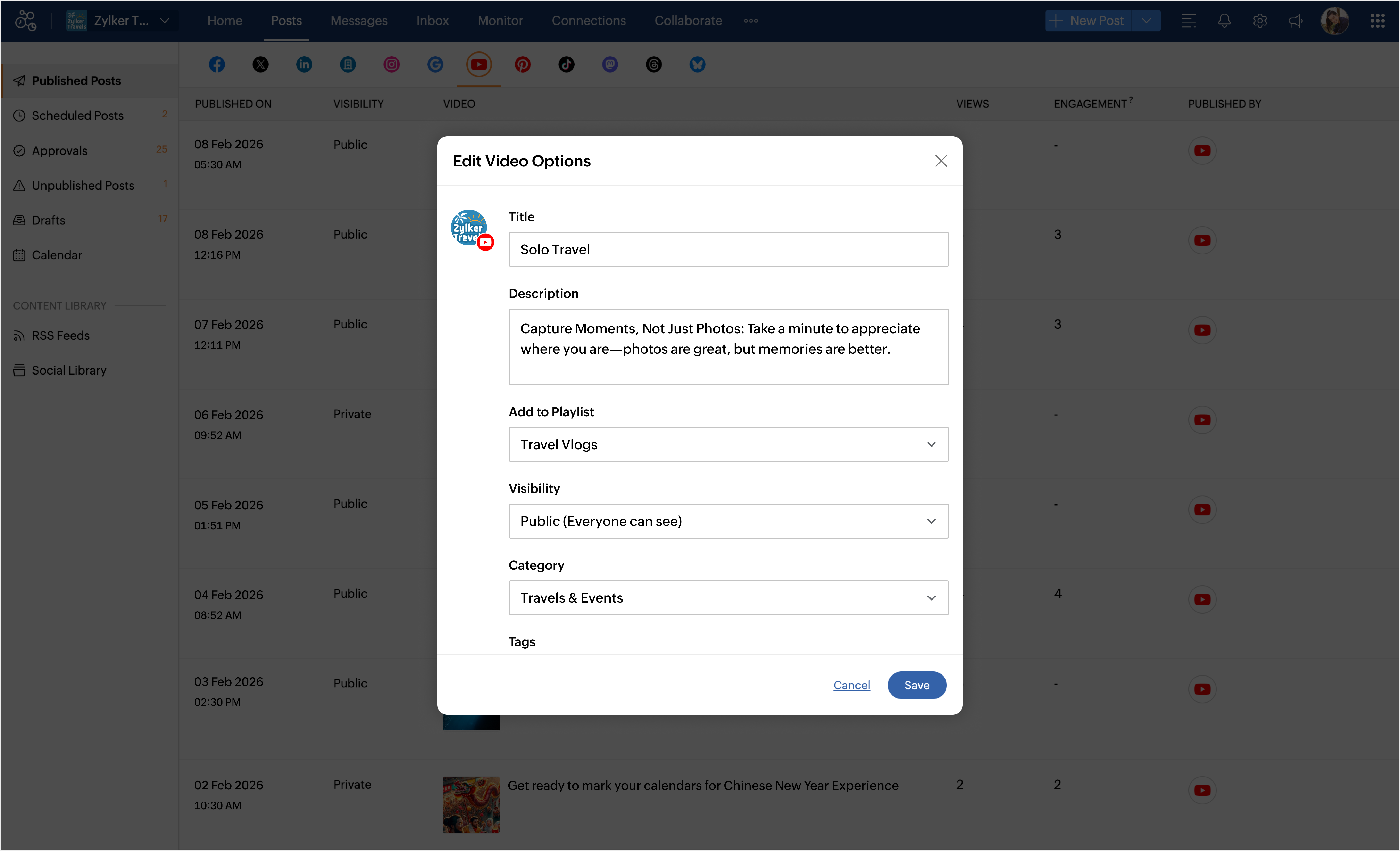 You can post to your YouTube channel from the Zoho Social web and iOS mobile applications.