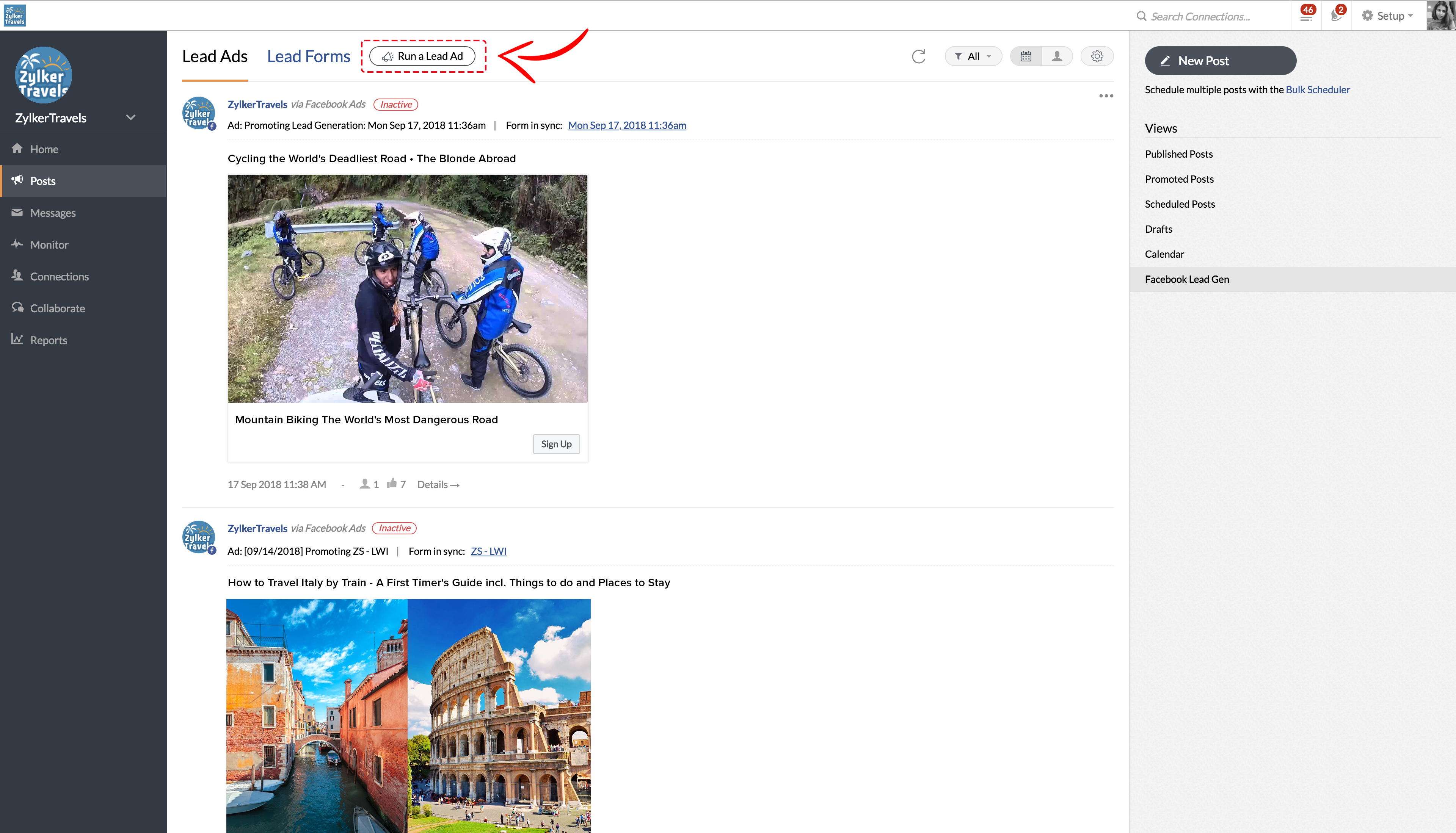 Click on Run a Lead Ad button on the top right corner of Facebook Lead Gen tab to create a new Facebook Lead Gen Promotion.