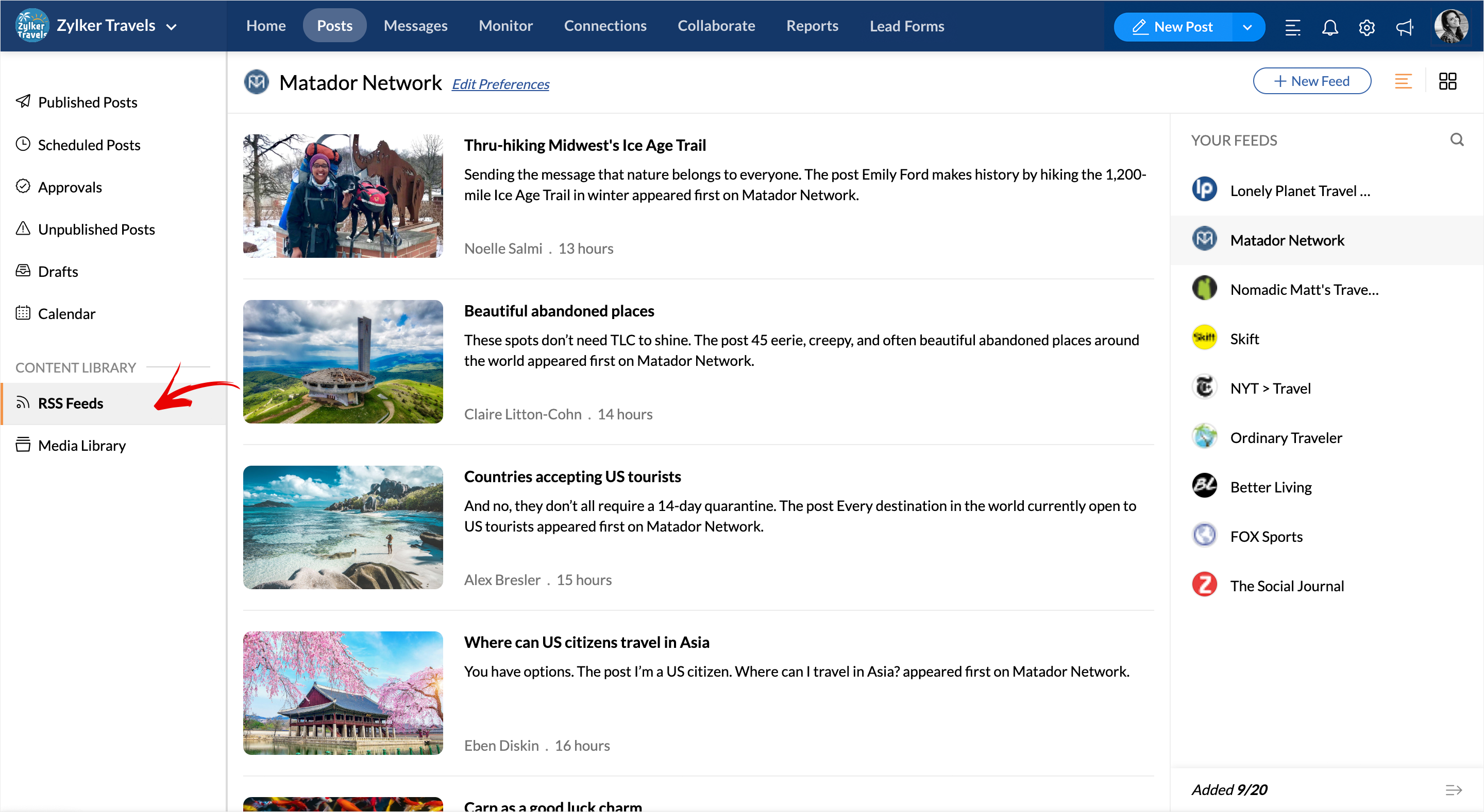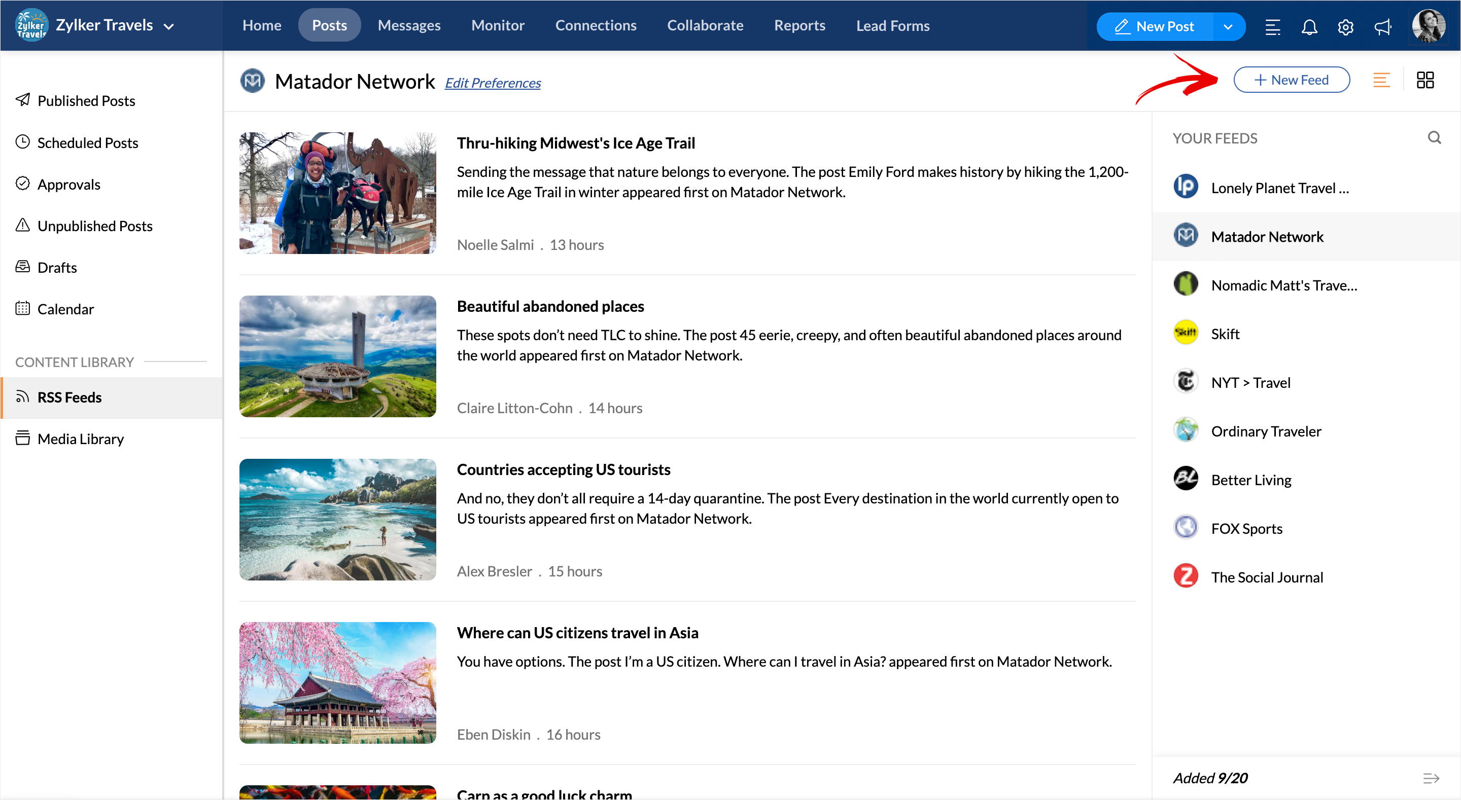 RSS Feeds is a one-stop solution if you consume new content and updates from specific websites that you follow. With the RSS Feeds Dashboard on Zoho Social, you can curate a stream of new content which you like to read delivered straight to you, and ...
