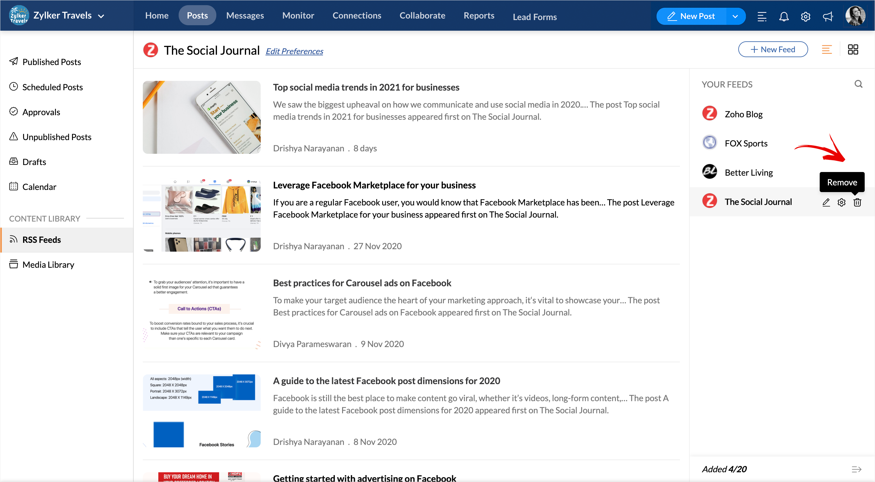 1. Click on the Posts tab on your dashboard. 2. Now, click on the RSS Feeds under Content Library. 3. Click on the +New Feed button on the top right corner. 4. Type the name of the Website or Paste the Feed link in the search bar or upload a ...