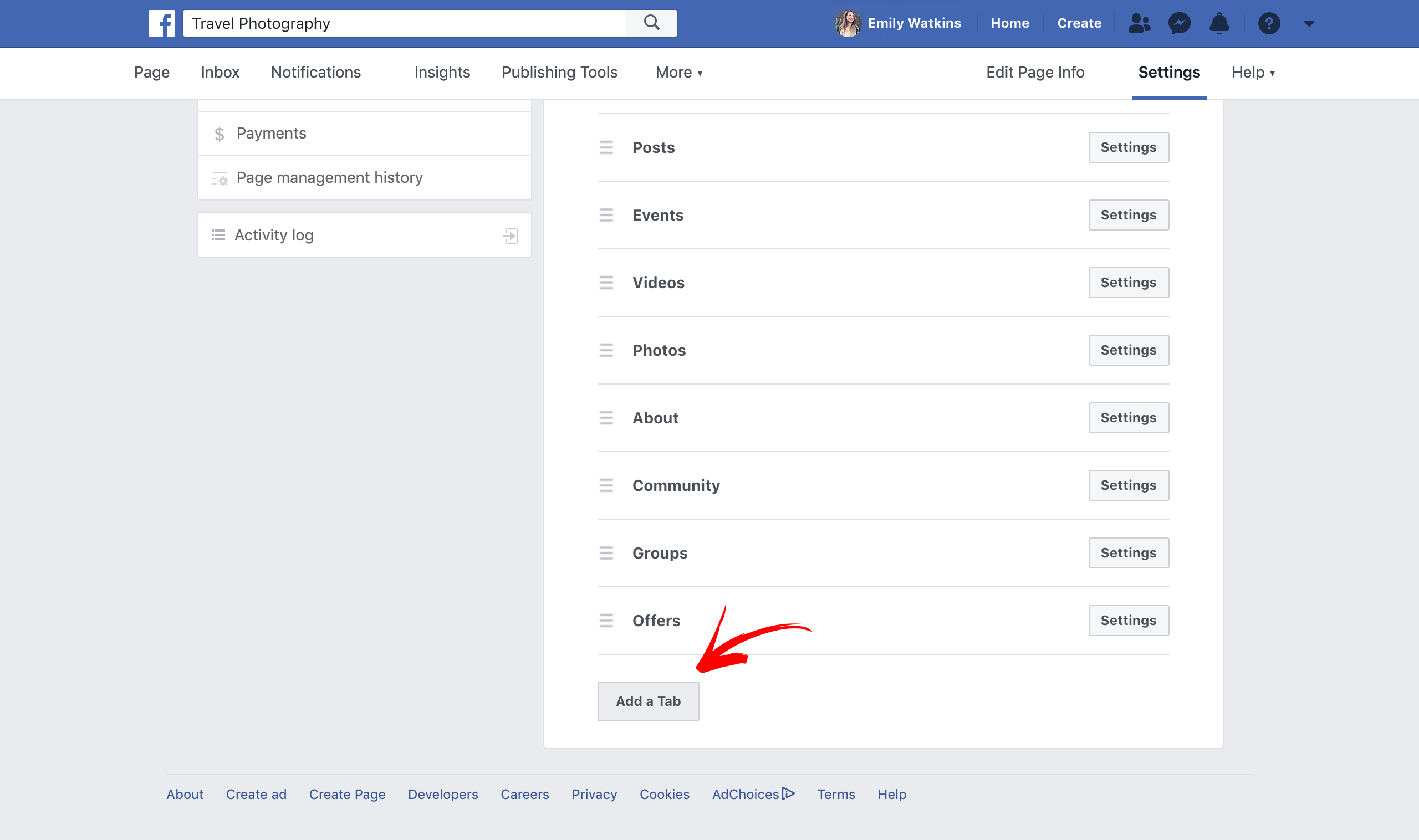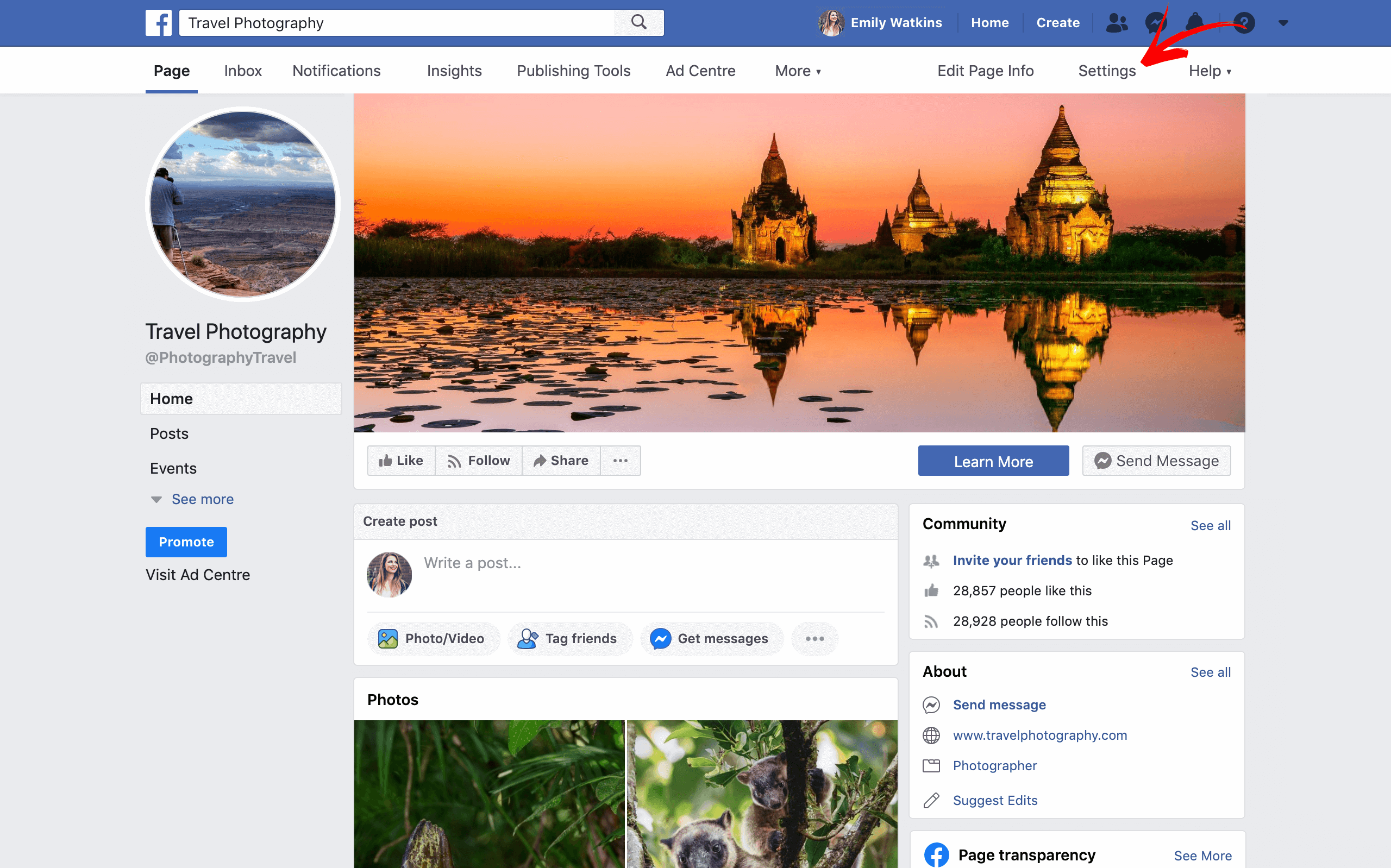 1. Login to your Facebook account and navigate to your business page, then click on the Settings option present at the header of the page.
