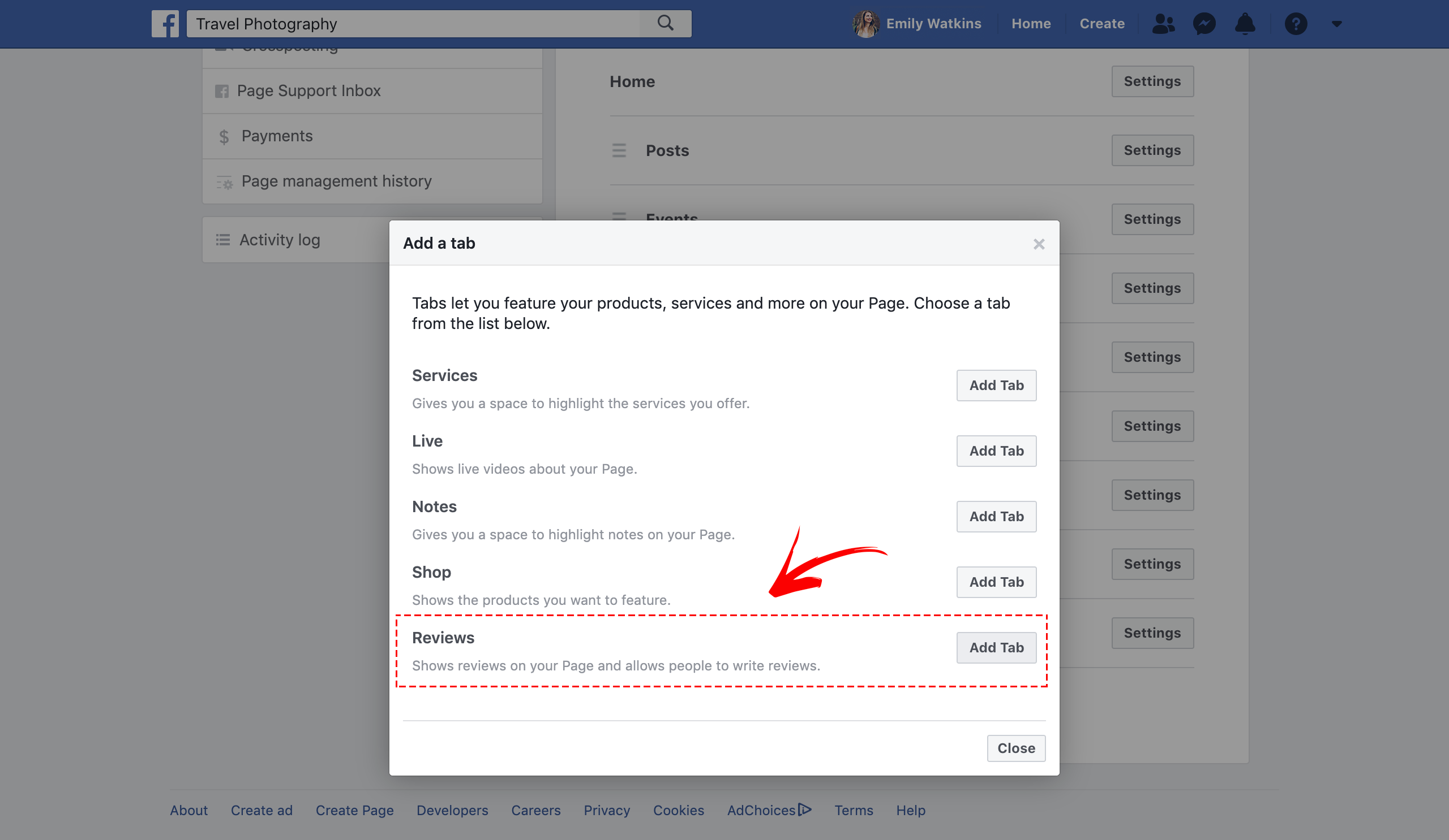 3. Scroll to the bottom of the page, click on the Add Tab button, select Reviews and hit the Add Tab button.