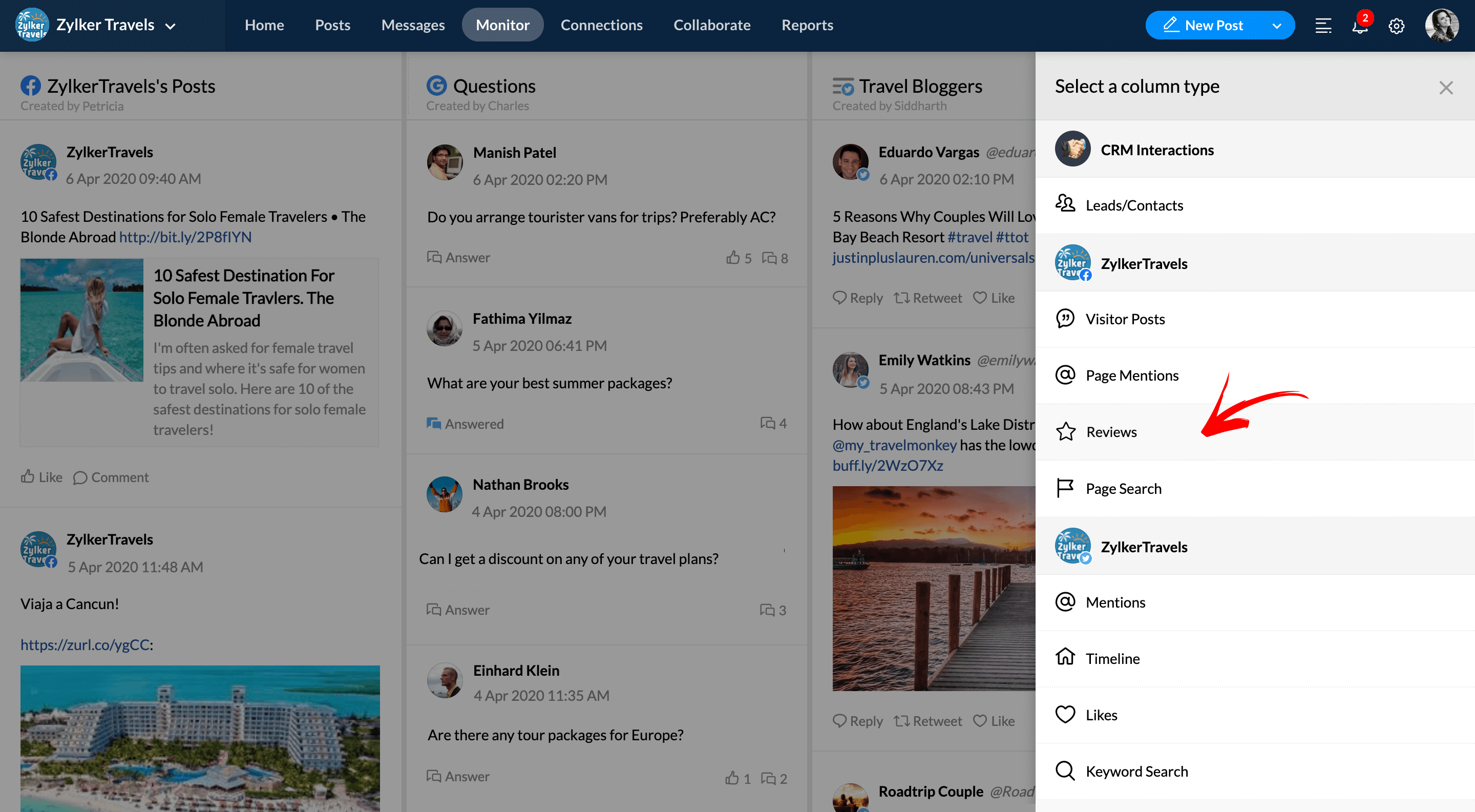 3. Select Reviews as the column type to view and oversee Recommendations and Ratings associated with your Facebook page.