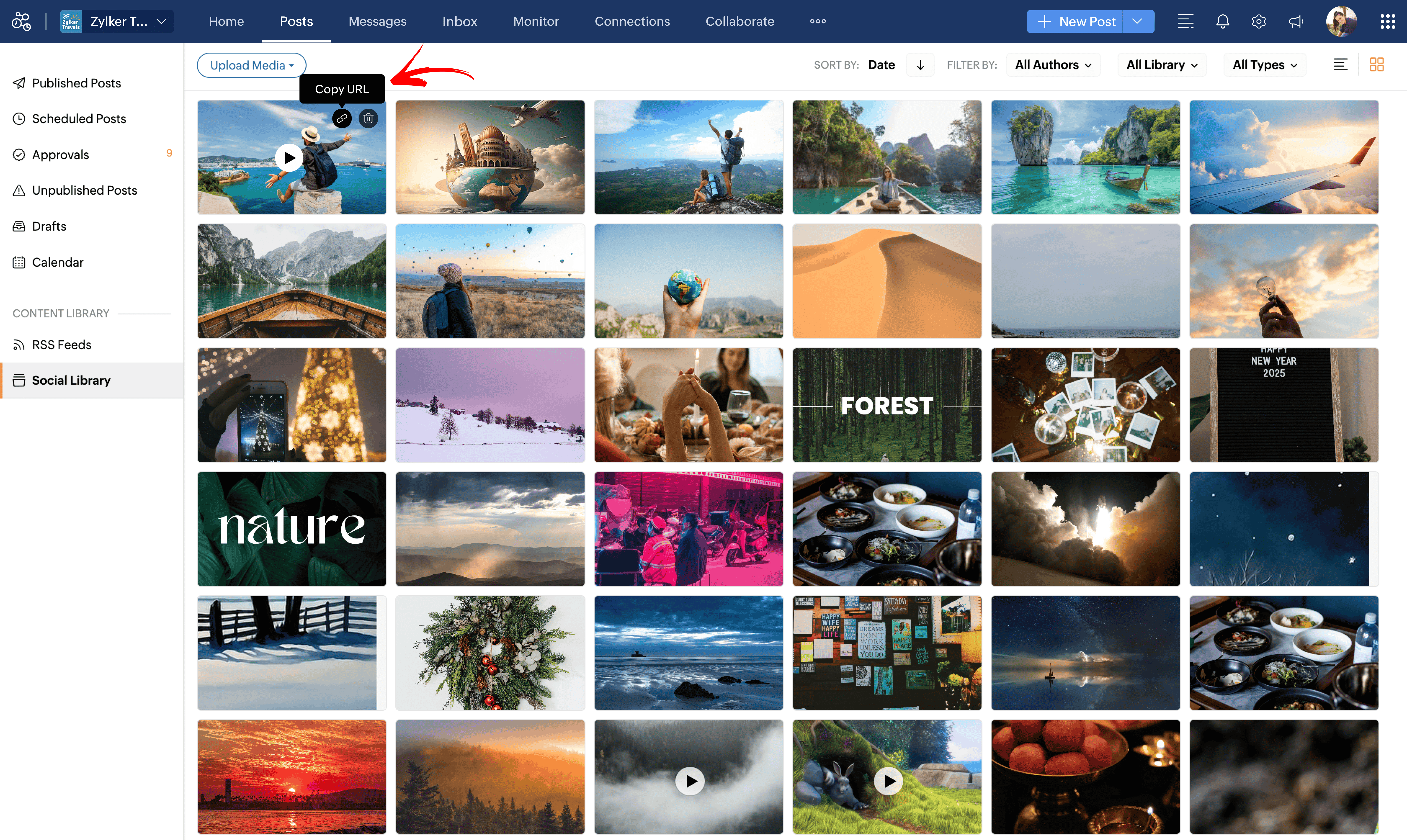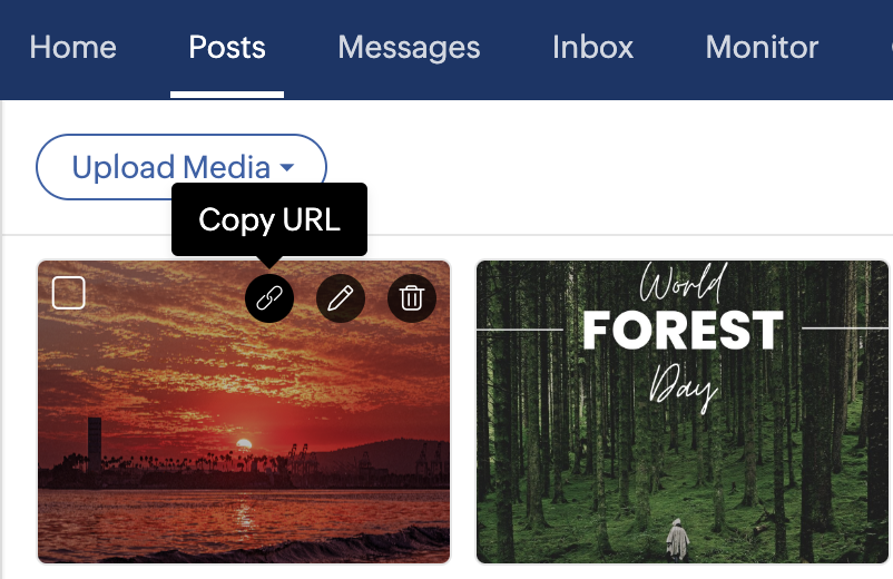 You can also upload it to the Social Library directly by clicking the Upload Media button in the Social Library under Posts tab. Once the image is uploaded, hover over it and click Copy URL to copy the URL and paste it in the spreadsheet to upload it for bulk scheduling.