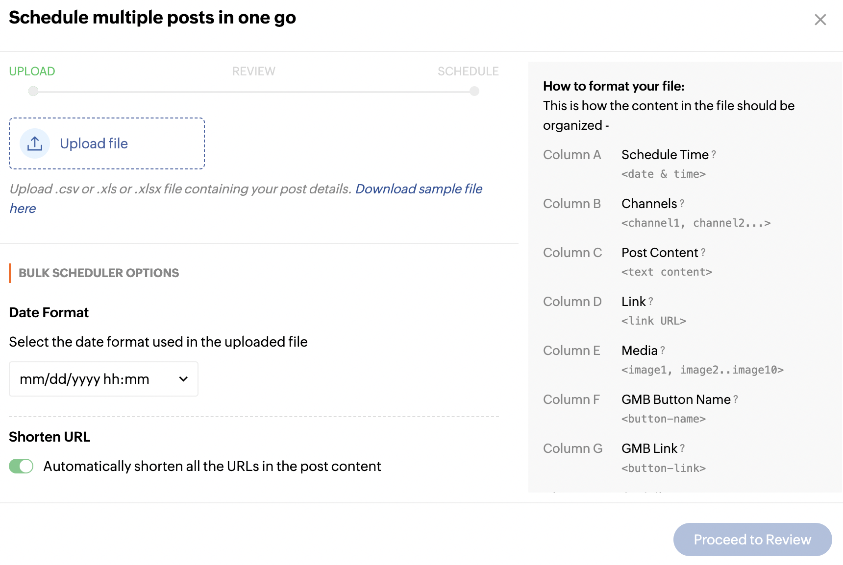 You can bulk schedule posts for all connected social channels by uploading a single spreadsheet on the Bulk Scheduler. You don't have to create separate spreadsheets for each social channel.
