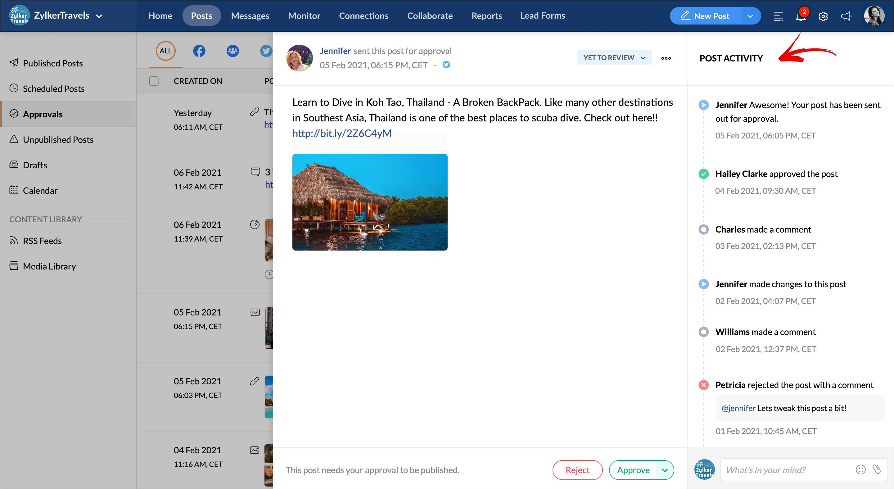 1. Go to the Posts tab on your dashboard and click on Approvals on the left-hand side menu.