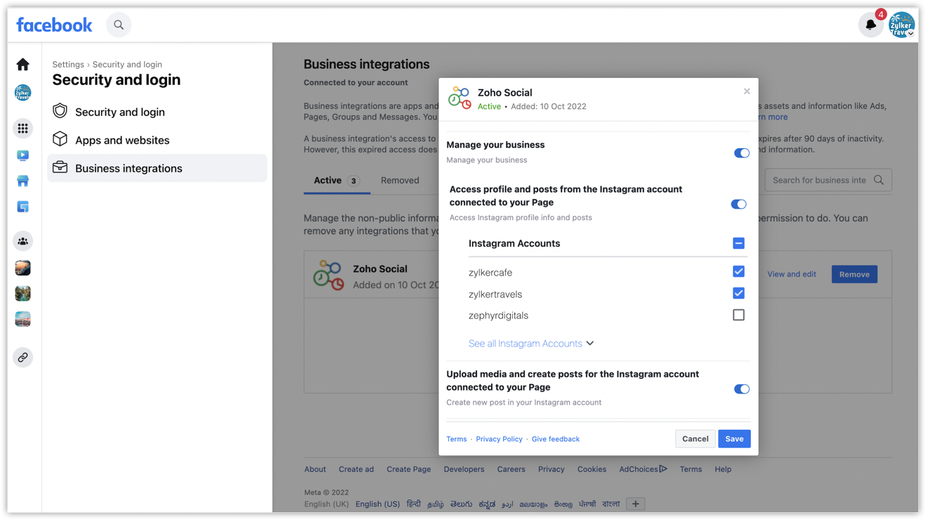 Sometimes when you are unable to connect your Facebook Page to Zoho Social, updating the Business Integrations manually on your Facebook account might be of help. Here's how you can do that.
