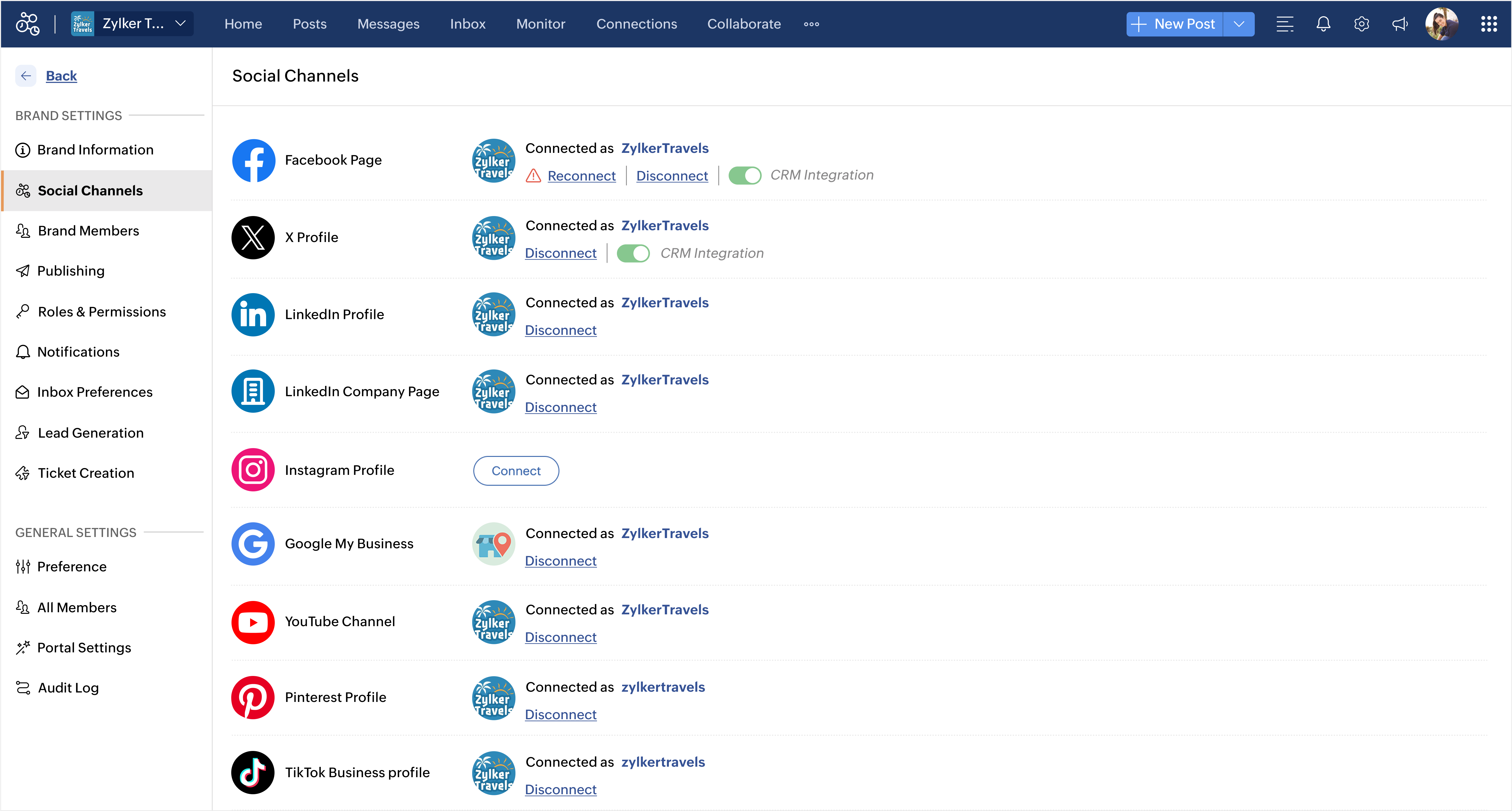 In cases where your network's token has expired, you've changed the password of your social account, or there have been changes in the API permissions between Zoho Social and the network, reconnecting the specific channel will help resolve the issue. Access tokens for Facebook, Instagram, and LinkedIn have a 60-day lifespan based on the network's design. Once this period expires, you'll need to reconnect the channels to continue using them in Zoho Social.