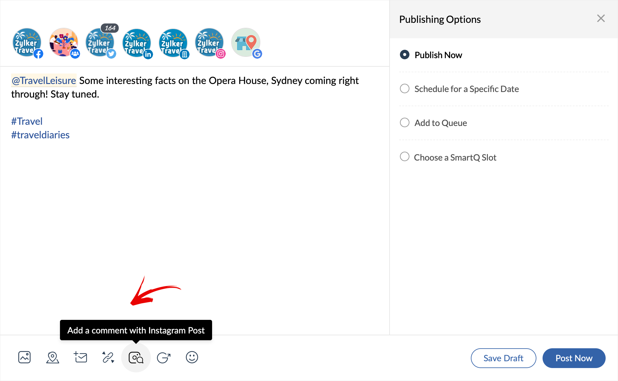 3. Once the first comment has been pre-loaded into your Instagram post, you can choose to publish it right away or schedule it for a later date from the list of all publishing options available on Zoho Social.