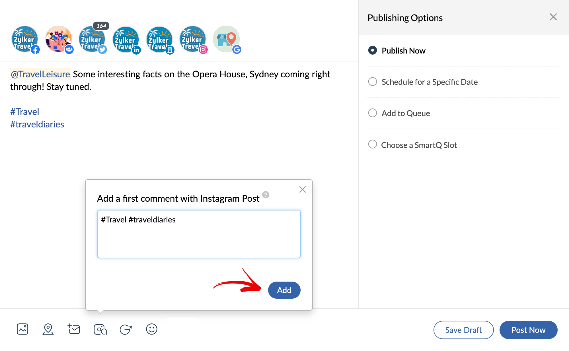 Yes, you can predefine an Instagram first comment, for any Instagram post that you publish or schedule from your Zoho Social web and mobile(Android and iOS) applications. Here's how you can go about it.