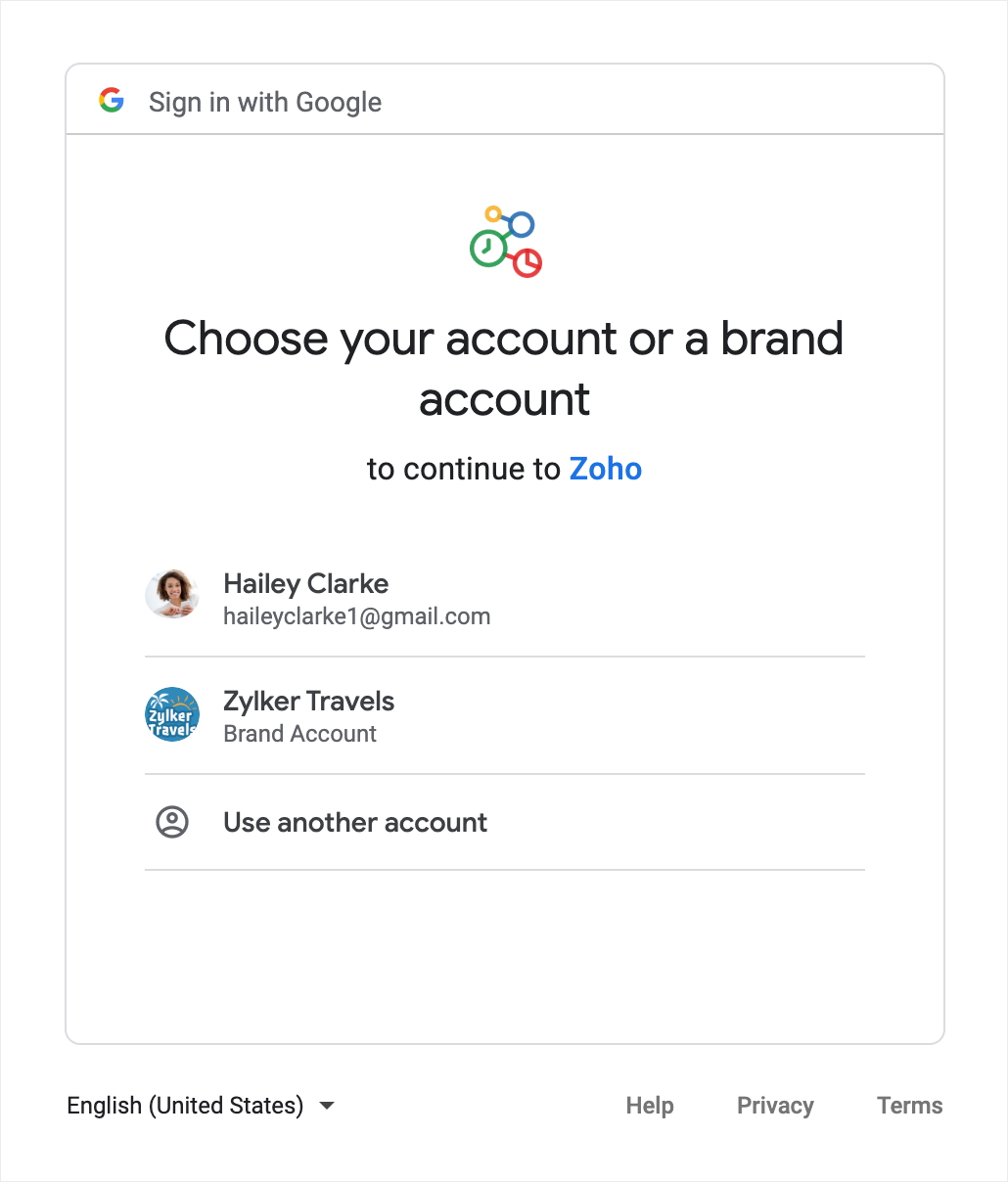 2.  Now, from the consent window, choose a Google account your channel is active on and hit the Allow button for Zoho Social to manage and view your YouTube channel.
