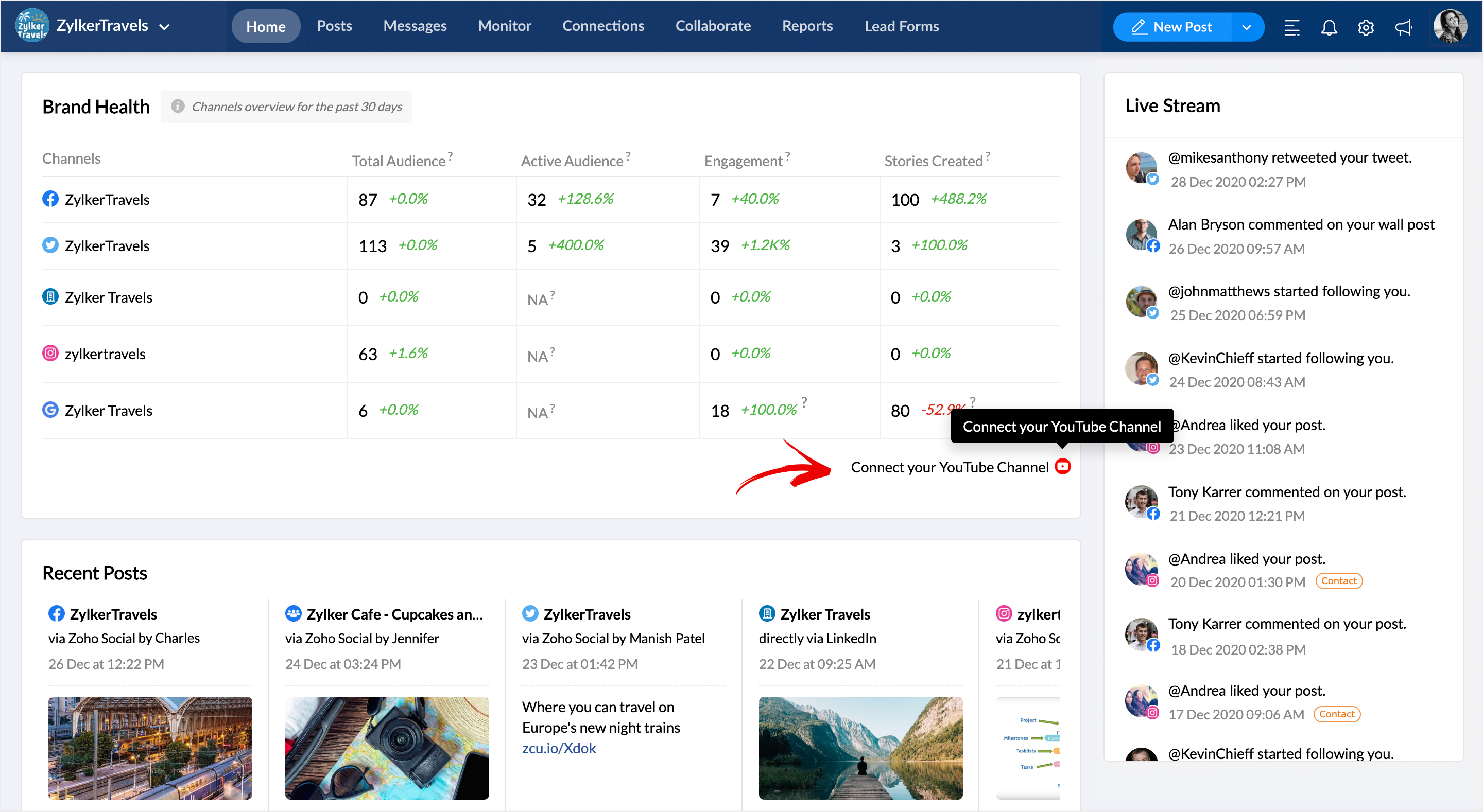 You can schedule and upload videos to your YouTube channel right from your Zoho Social Dashboard. The first step to that is connecting your YouTube account to Zoho Social. To do that, follow these steps: -> Click on the Home Tab and tap on Connect ...
