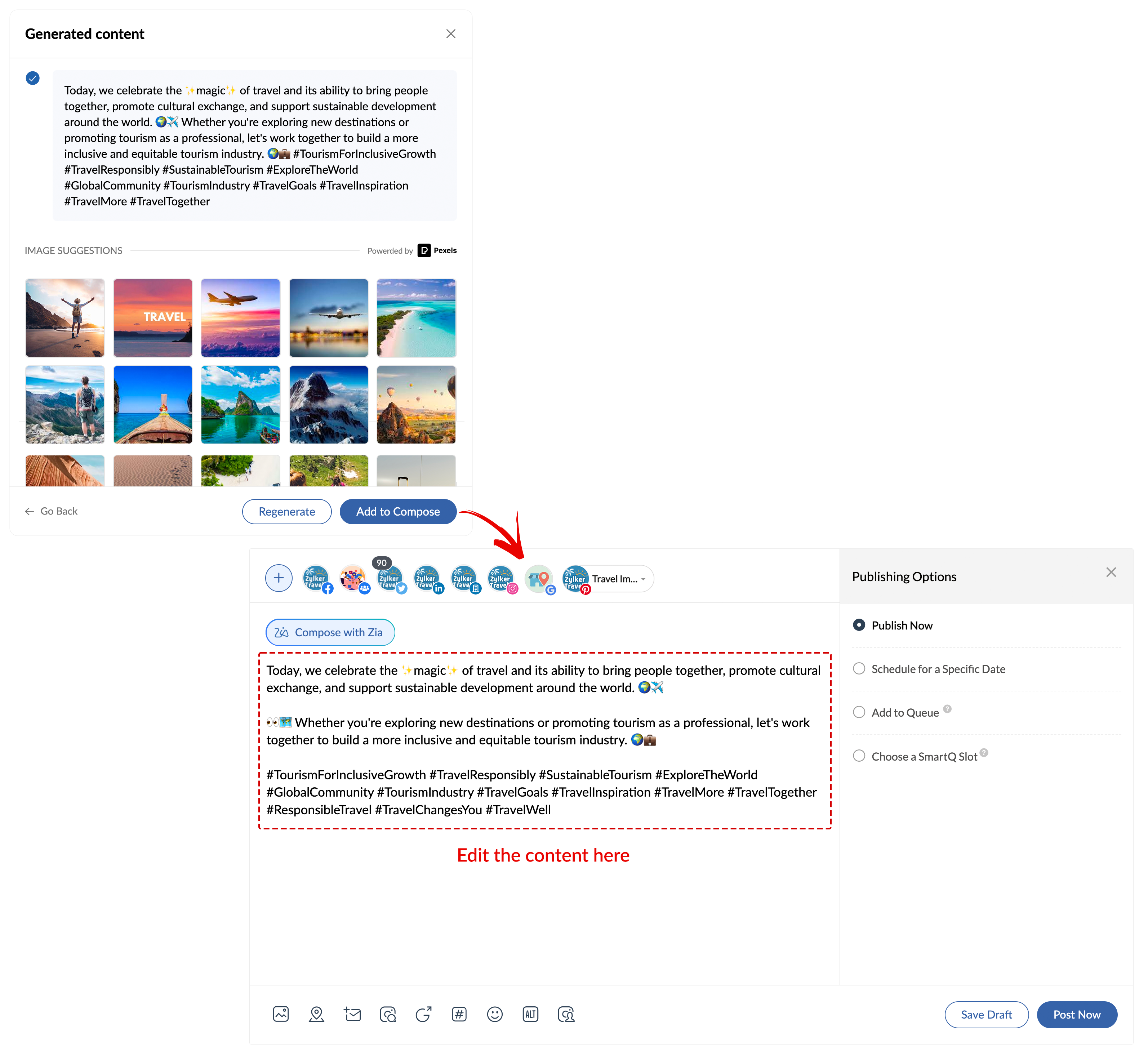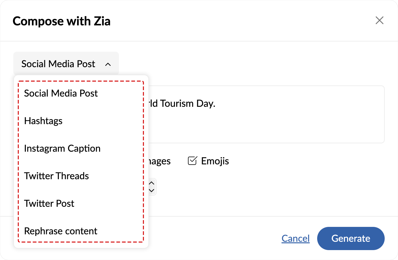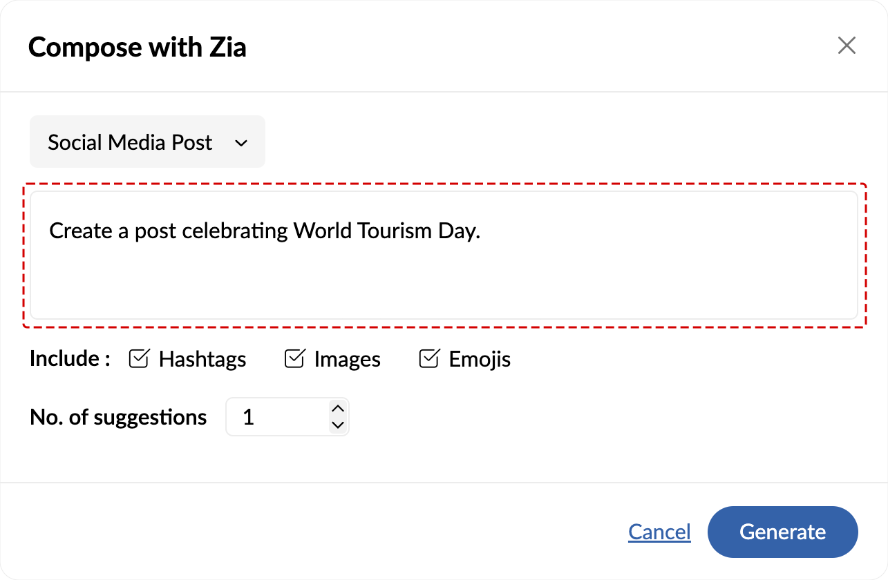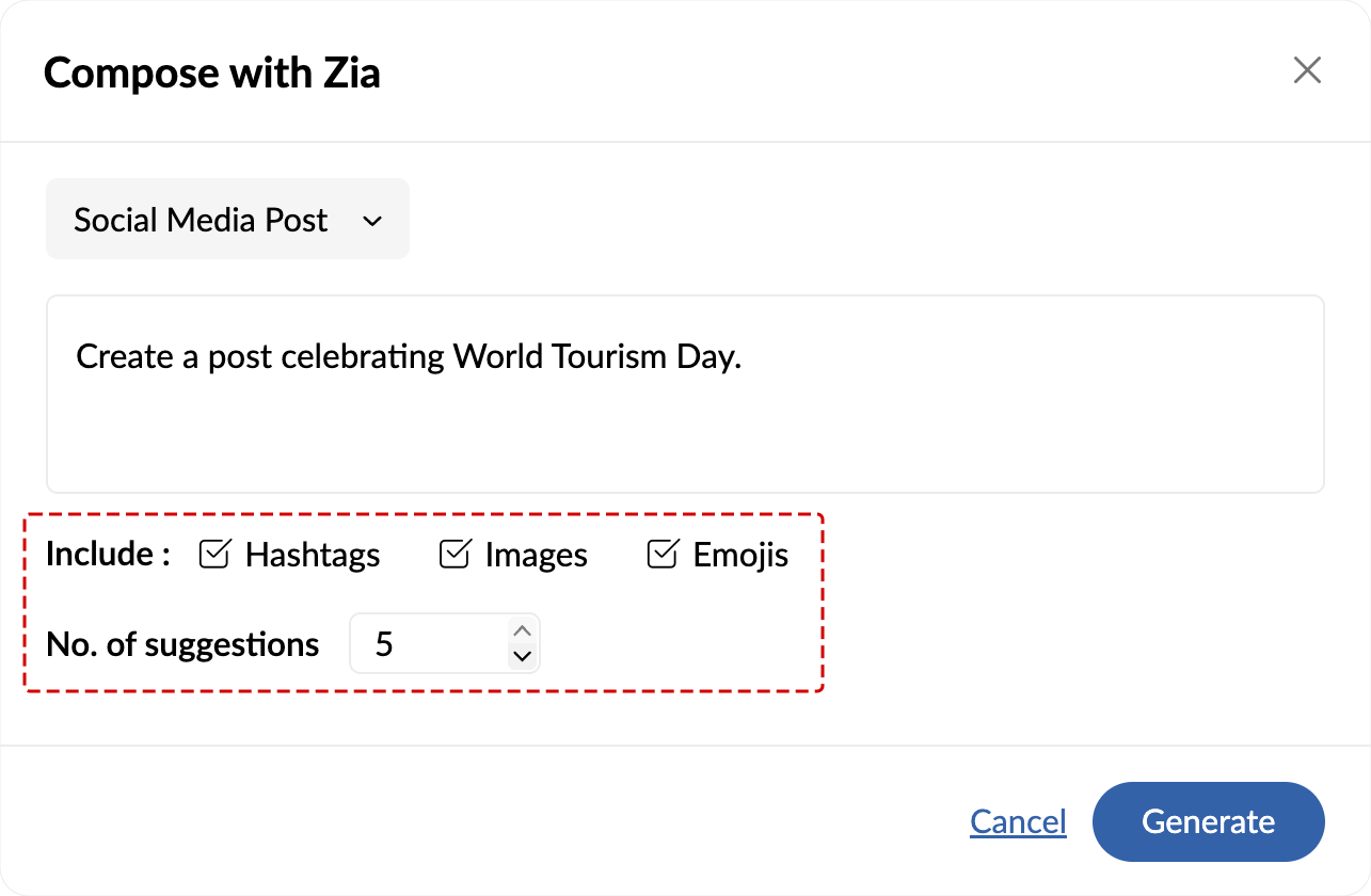Zia can generate a maximum of five suggestions at a time. You can also choose to include images, hashtags, and emojis.