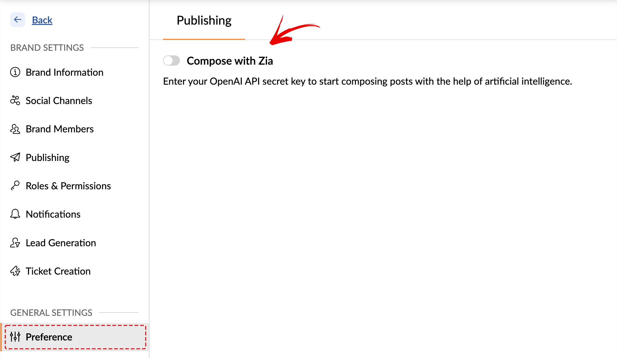 To deactivate Zia in Zoho Social, go to Settings > Preference > Publishing and disable the Compose with AI toggle switch.