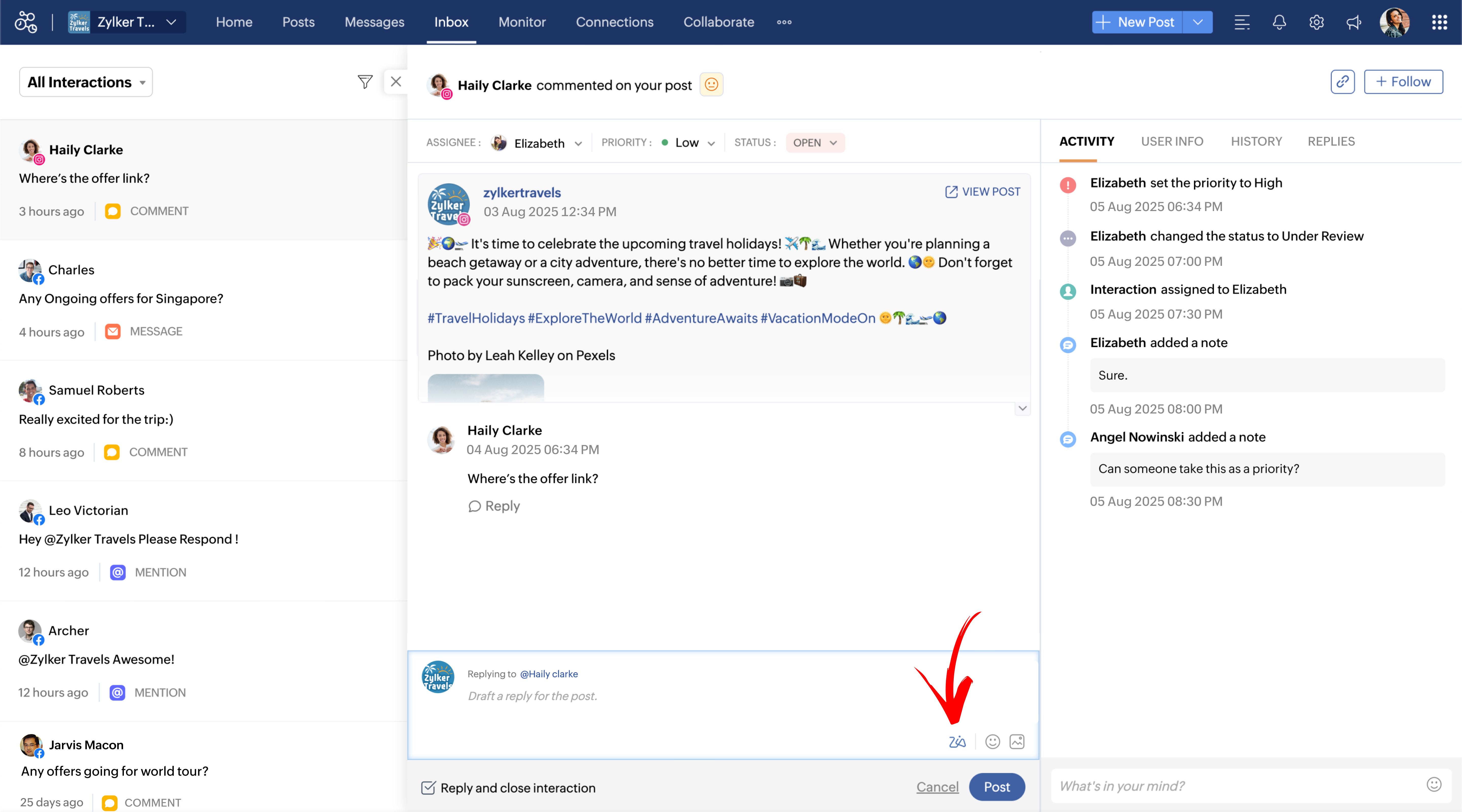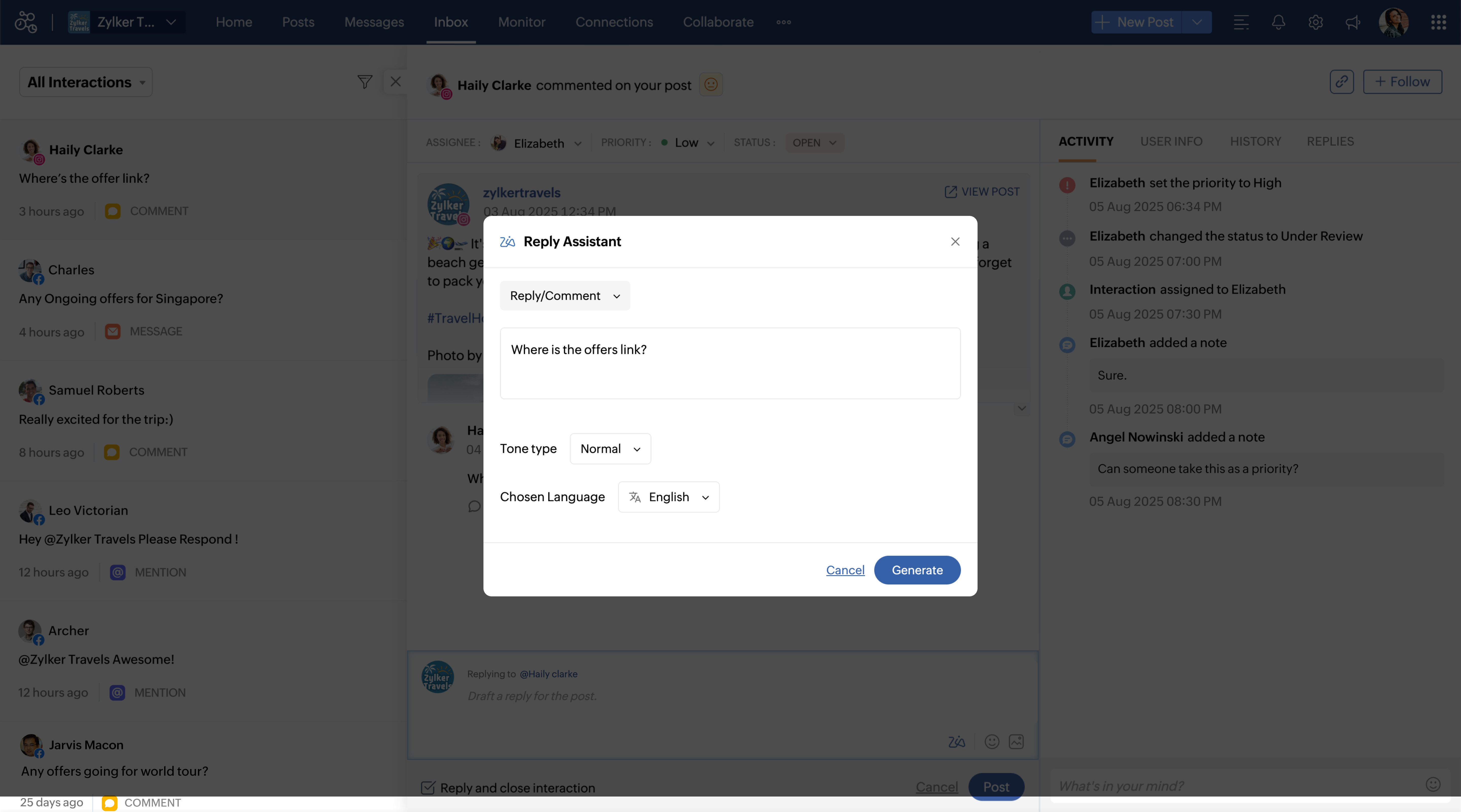 2. Click  to reply, comment ,or rephrase content using Zia.