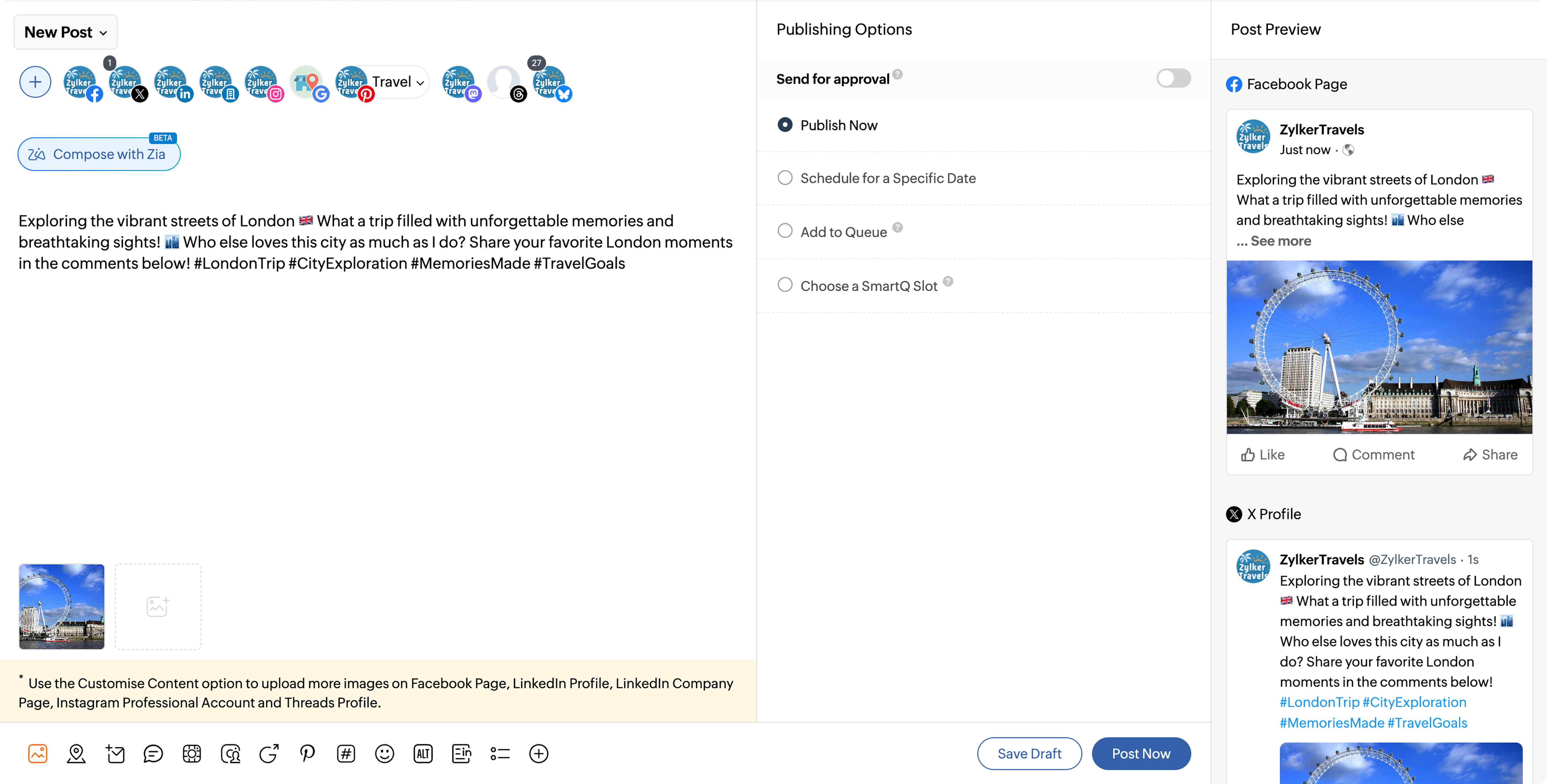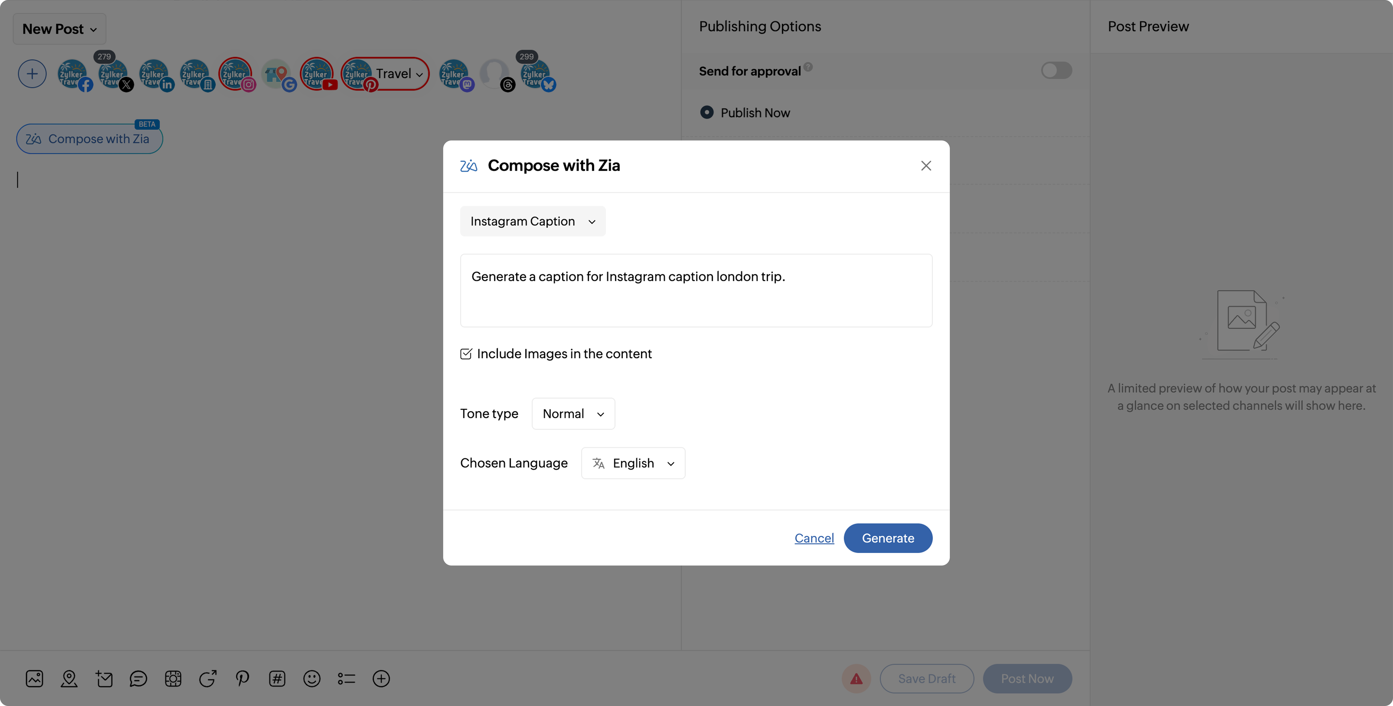 Helps you generate engaging content for your social media posts. Zia can create captions, rephrase your existing text, give hashtag suggestions, customize tone and language and even generate images to enhance your posts.