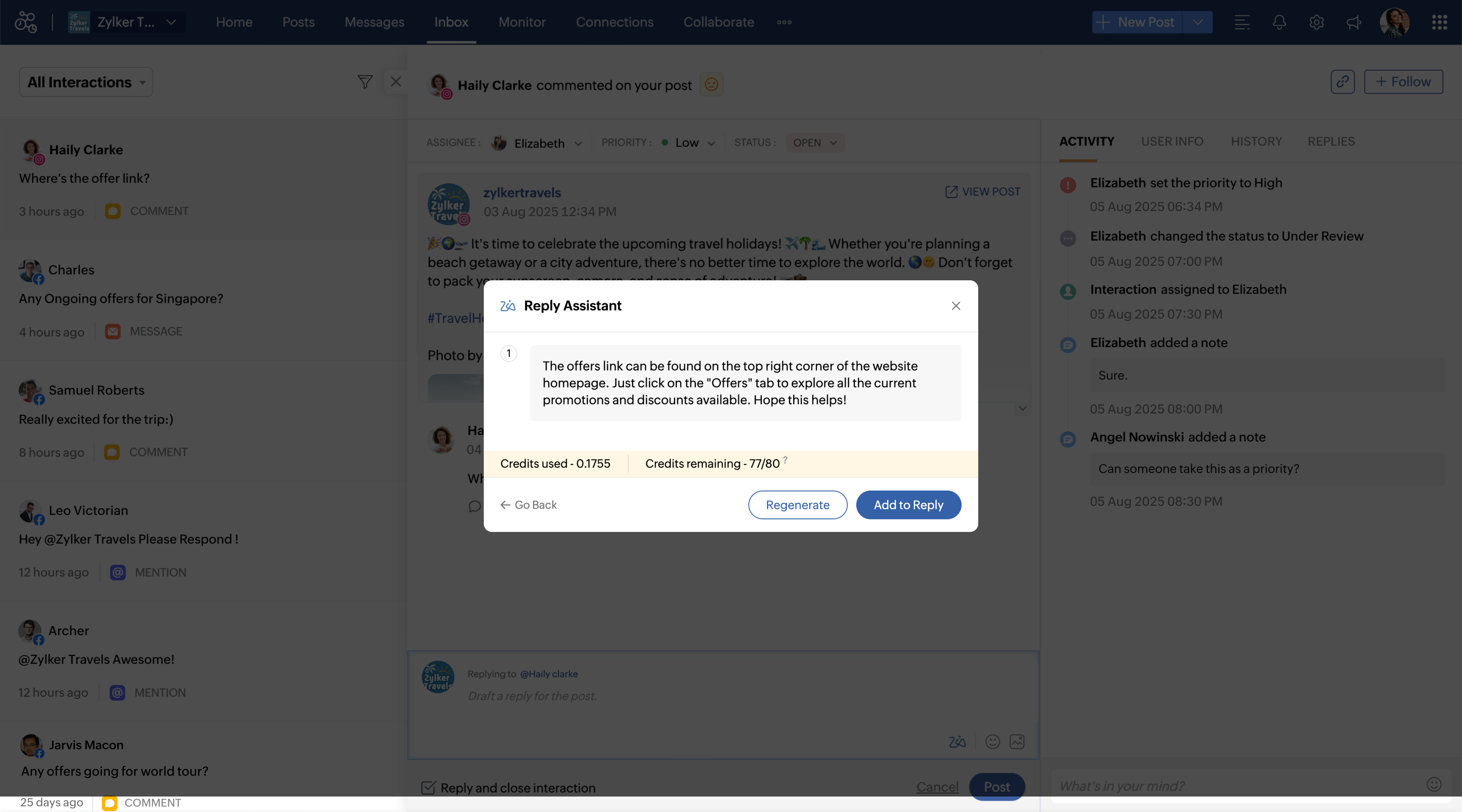 Zia, Zoho’s Gen AI assistant, transforms the way you manage content in Zoho Social. Designed to assist you at every step, Zia understands the context and helps you compose captions, generate replies, optimize your content and so on. From saving time to enhancing creativity, Zia streamlines your social media tasks while keeping your brand voice consistent and your messaging relevant.