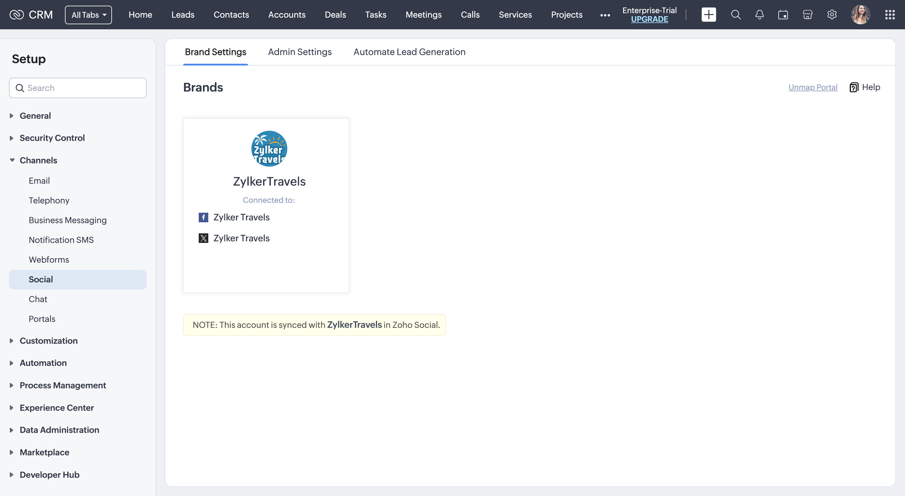 If you have already connected your social channels on Zoho Social, the same set of social channels will be available as a Brand in Zoho CRM's Social tab. You can import this Brand to Zoho CRM to complete the integration.