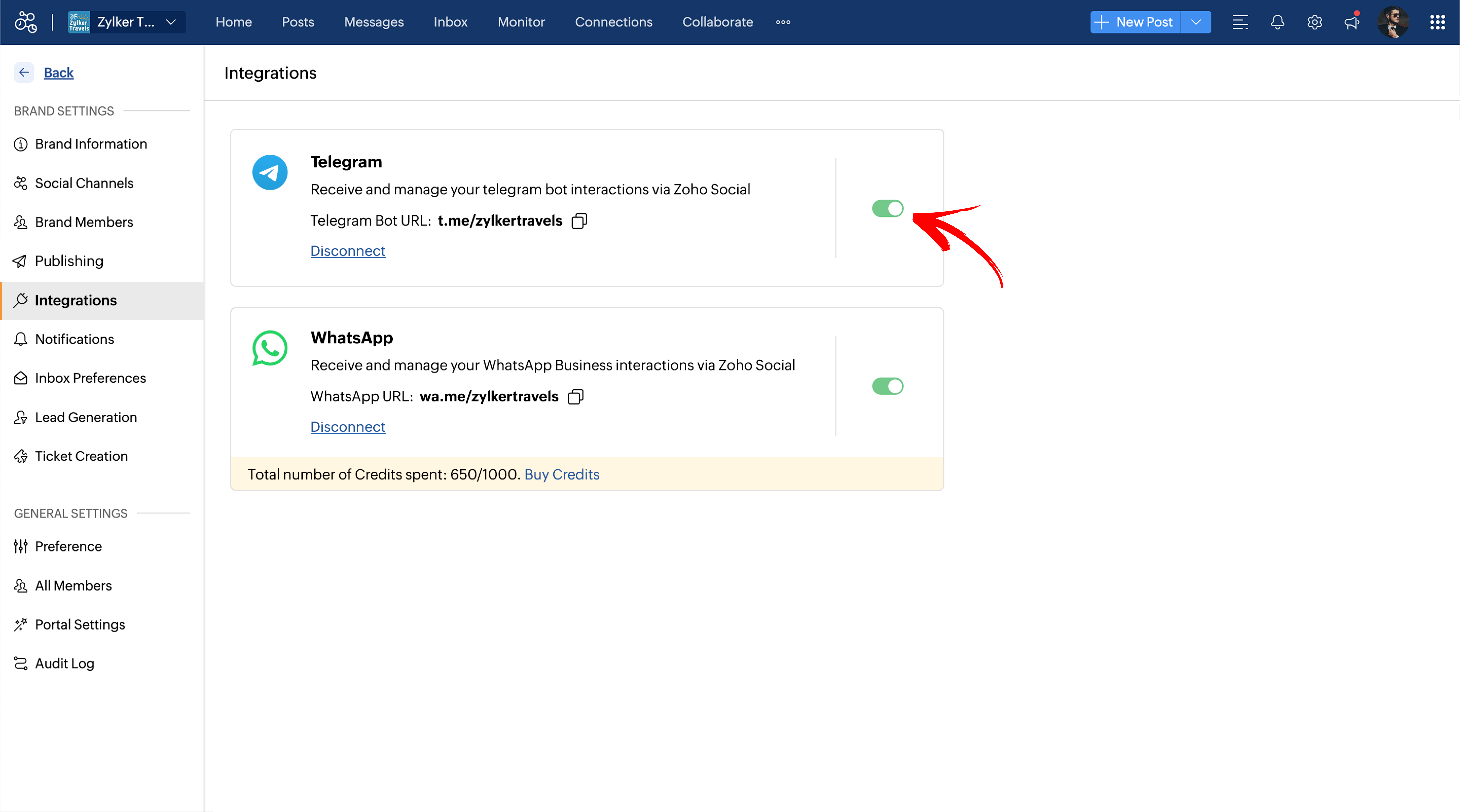 To integrate a Telegram account with Zoho Social
