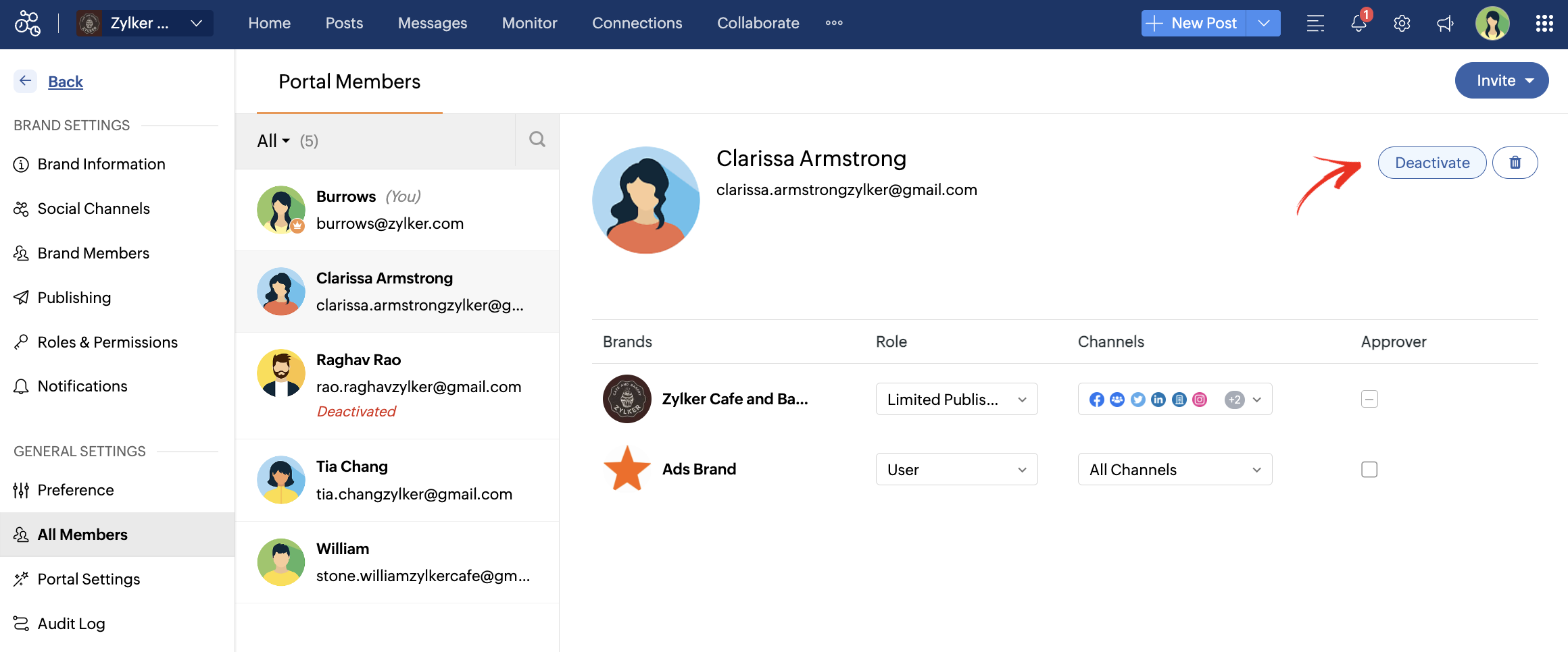 When a Portal member is deactivated, they'll no longer have access to the entire Portal in Zoho Social. The status of the member will be marked as Deactivated. You can choose to re-activate a member if required, and an email invite will be sent inviting them to join your Portal once again.