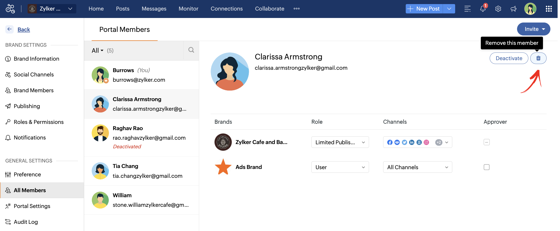 When a team member is removed from the Portal, they'll no longer be part of the Zoho Social account. All access to different Brands in your account will be completely revoked.
