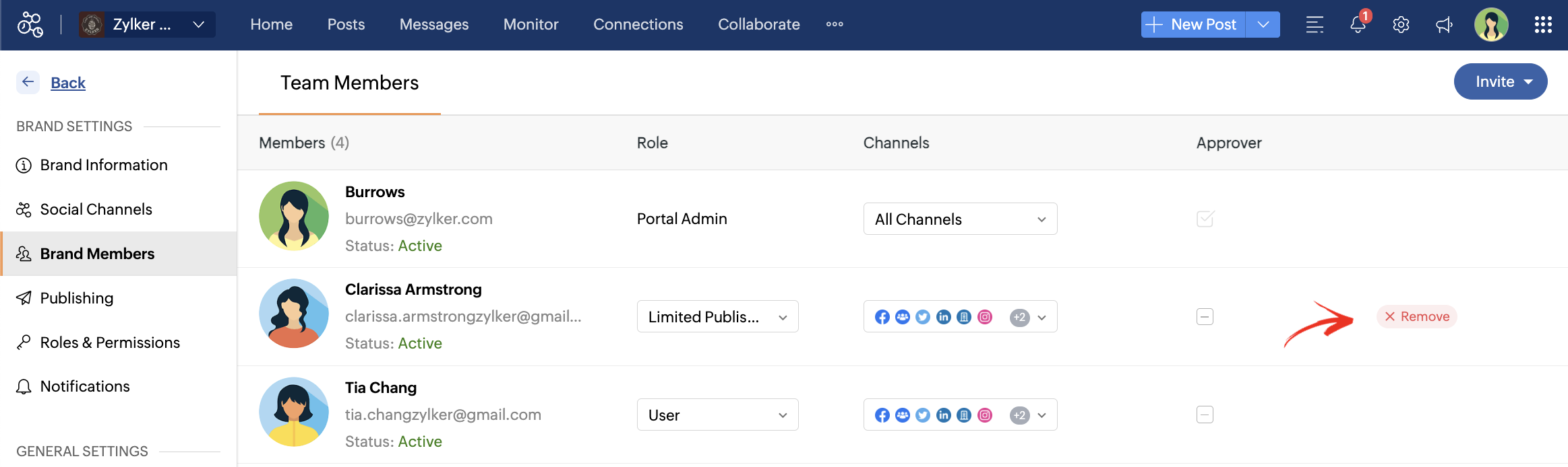 When a Team Member is removed from a Brand in Zoho Social, they'll no longer have access to the Brand from which they're removed. Access to other Brands in Zoho Social account won't be affected.