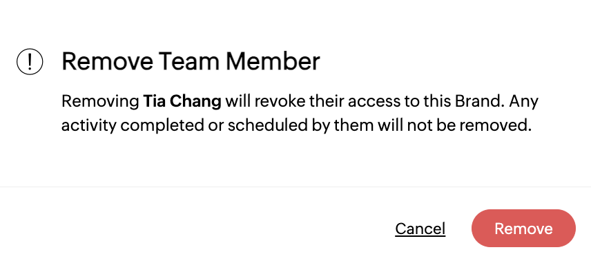 - Hover over the Brand section and click Remove next to the Brand from which you want to remove the team member.