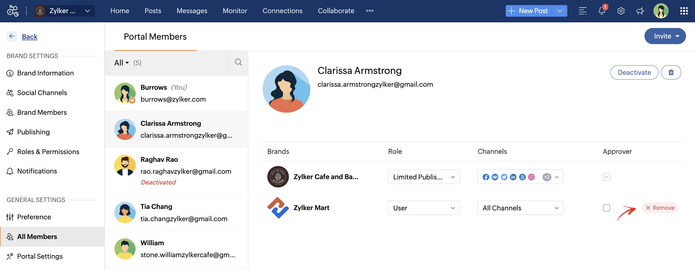 For example, let's say Amelia Burrows is part of three Brands in Zylker's Social account: Zylker Cafe and Bakery, Zylker BnB, and Zylker Holidays. If the Portal Admin removes Amelia Burrows from Zylker Cafe and Bakery in Zoho Social, Amelia will continue to have access to Zylker BnB and Zylker Holidays and can carry out her social media activities.