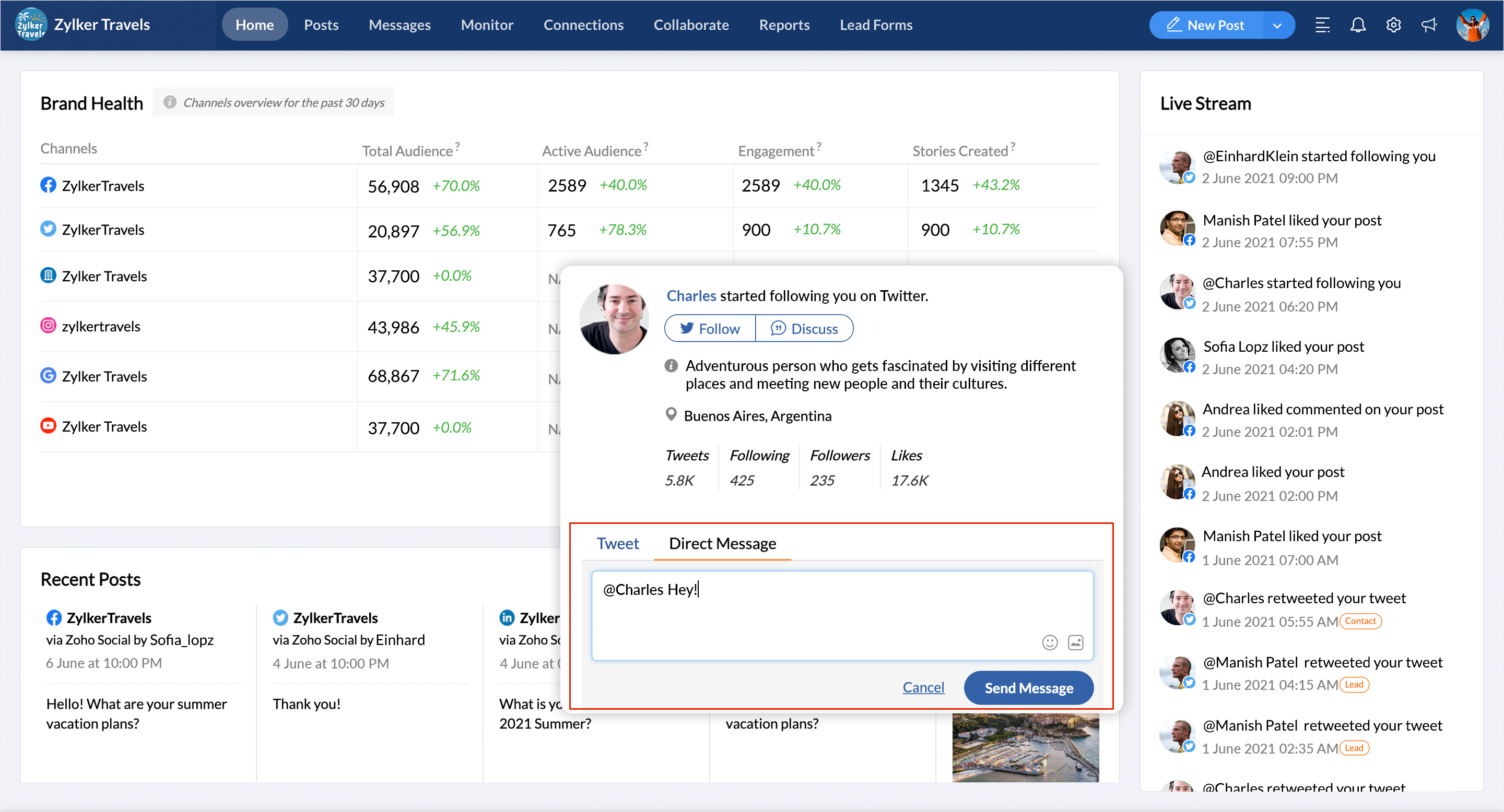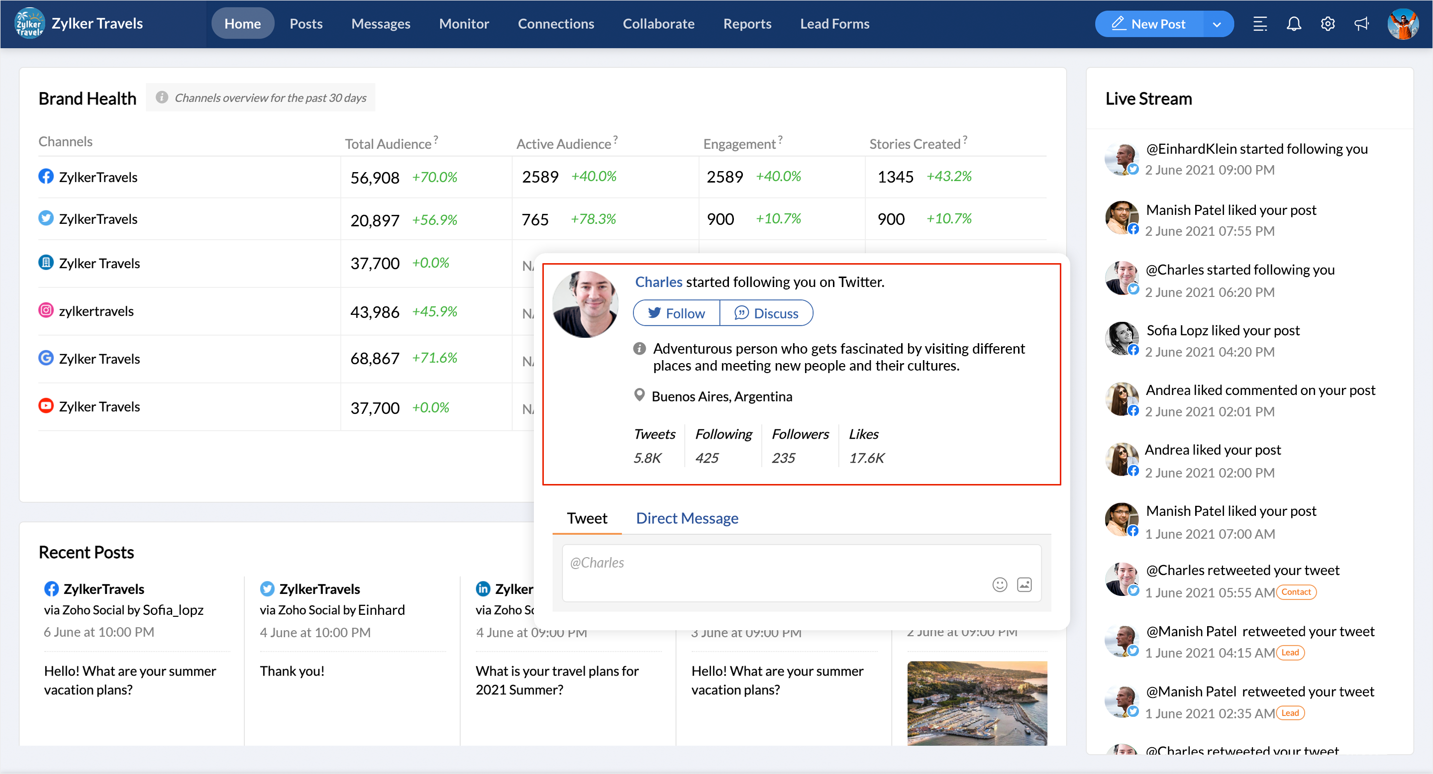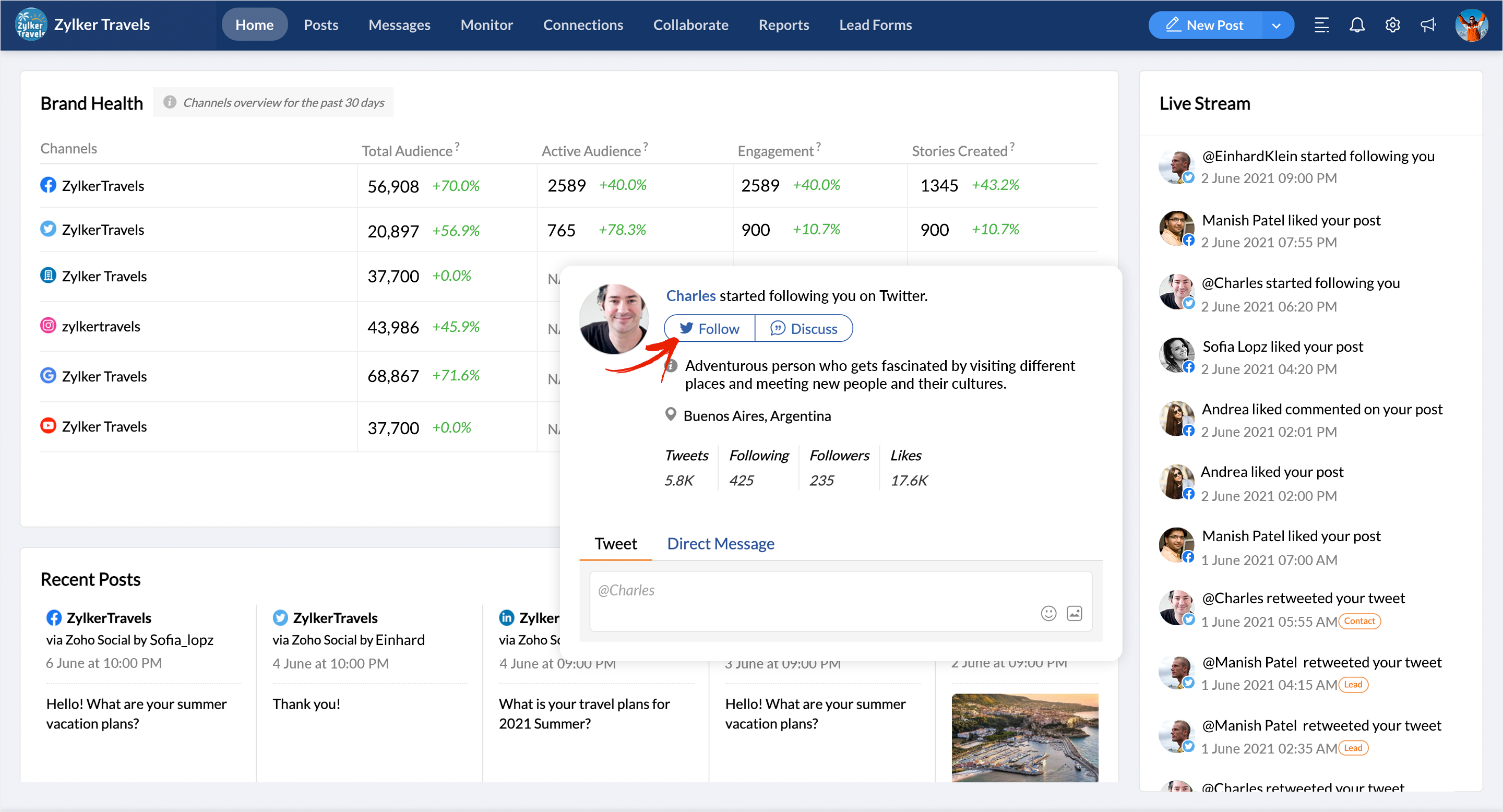 Live Stream is a dynamic mini feed of the notifications you receive on a daily basis, it's actionable and adds context to your updates. There may be times when you'd like more information on the people engaging with your brand. That's when you go to the Live Stream, then click on any notification to view detailed info about the person or profile that's engaging with you. It's that simple.