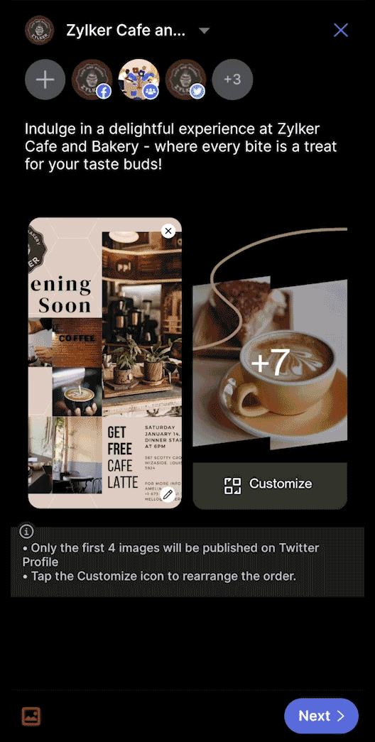 While creating a carousel post, you can choose up to 10 images or videos from your gallery. Based on the media limitations, only the first four images will be published on Twitter, the first nine images on LinkedIn, and the first image on Google My Business profiles. Similarly, only the first video will be published on all these channels.