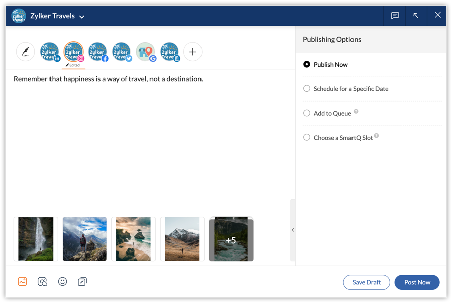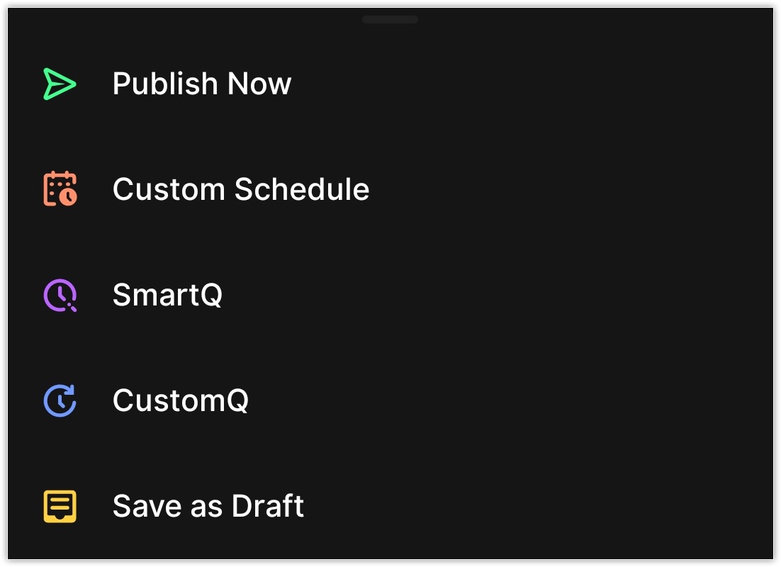 You can choose Publish Now to publish the post right away, schedule the post with the help of SmartQ or CustomQ. You can also set a custom schedule time, or save the post as draft.