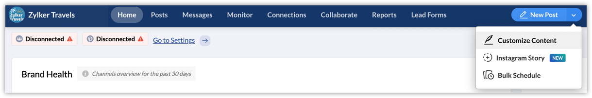Alternatively, click the drop-down next to New Post and click Customize Content to add 10 media items(images and videos) for Instagram, 10 images for Facebook, and nine for LinkedIn.