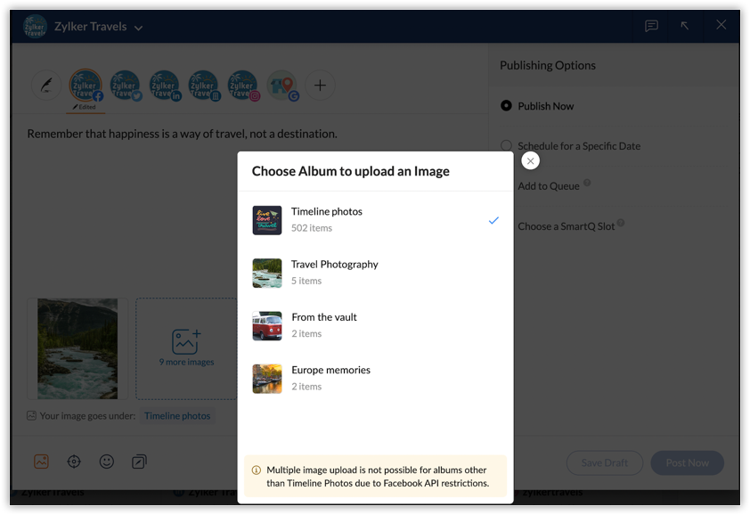 You can use Zoho Social to make a carousel post on your social channels like Instagram, Facebook and LinkedIn. For this, ensure that the images you want to add are of the dimensions specified by