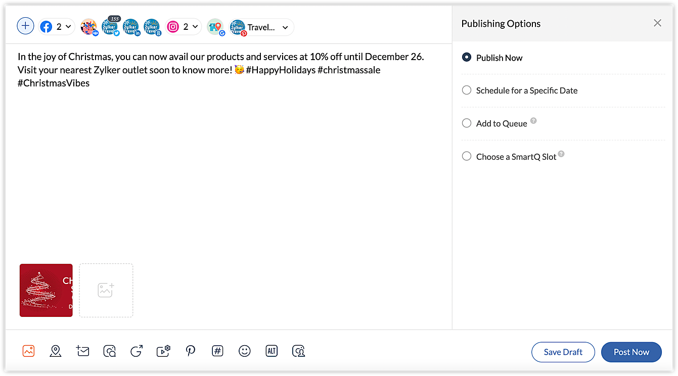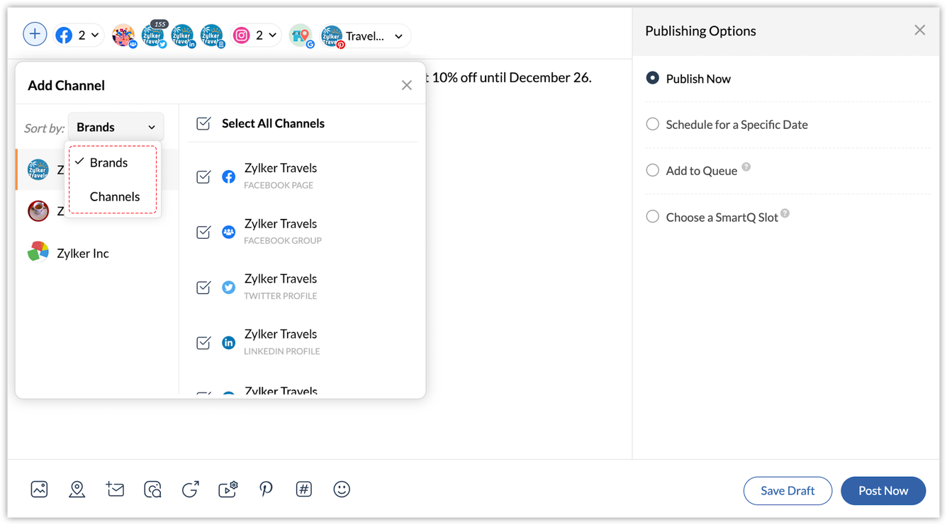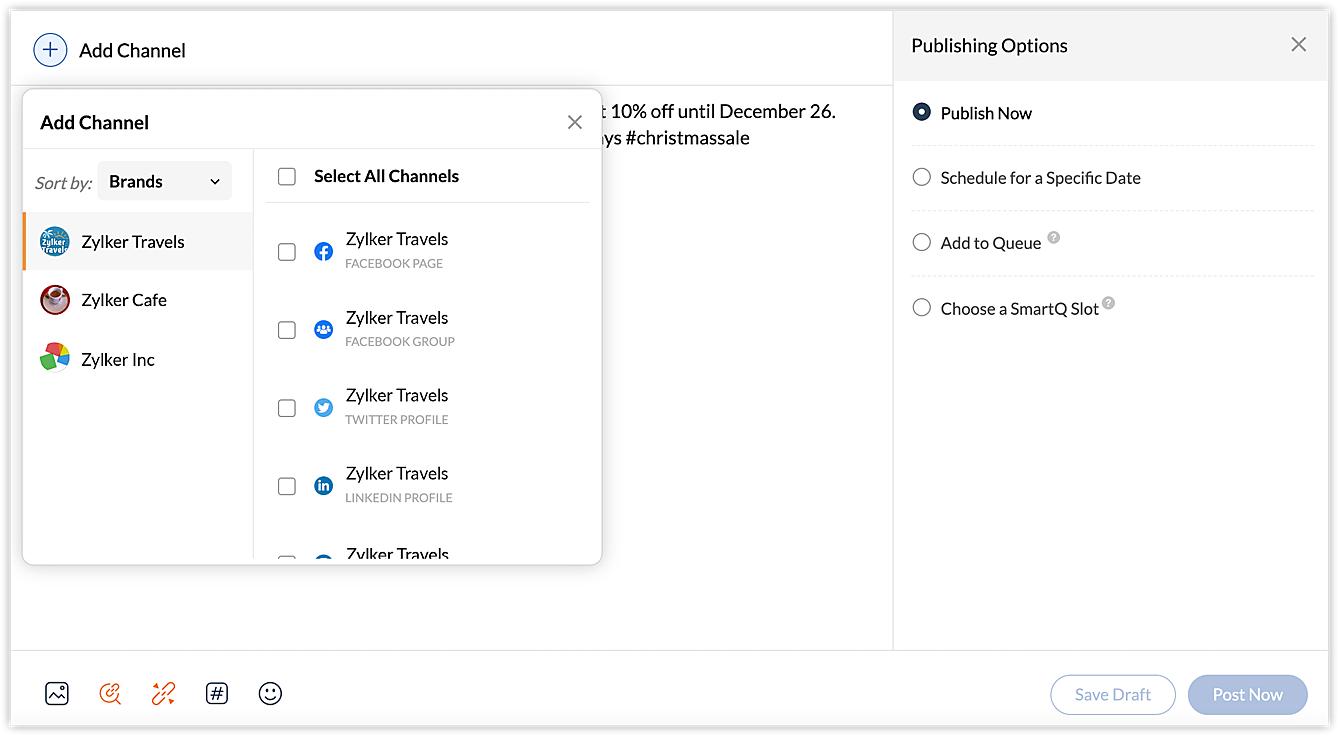 - Zylker manages multiple businesses, including Zylker Travels, Zylker Cafe, and Zylker Stores, and uses Zoho Social for their social media management. Zylker is planning to announce an overall discount for all their products and services for Christmas, on the social media handles. The cross-brand posting feature on Zoho Social will help Zylker to handle publishing hassle-free.