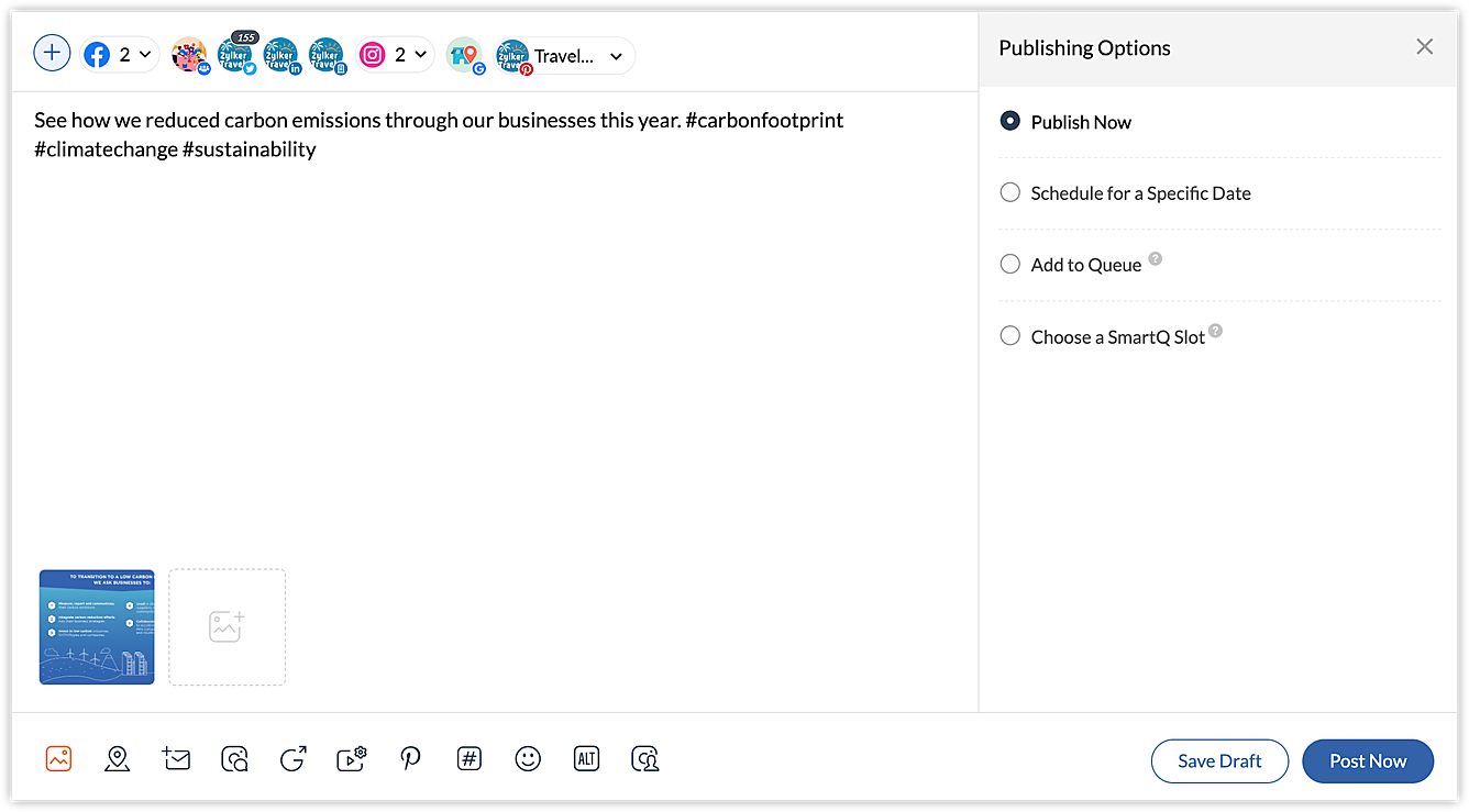 - Zylker ran an initiative throughout all their business chains to reduce their carbon emissions. To run this campaign, and to keep their customers and followers informed about the updates, Zylker used the cross-brand posting feature for their announcements, contests information, and other social media posts.