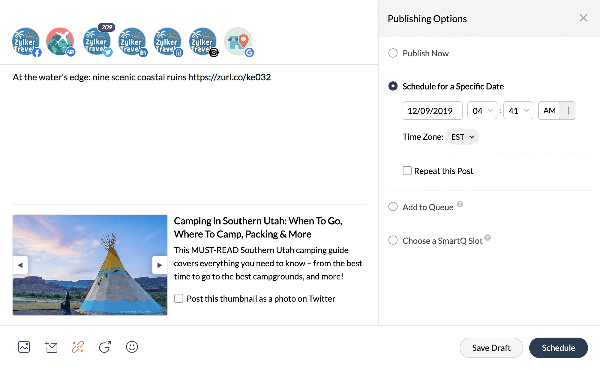 4. You can also choose the following options: Post Now, Custom Schedule, SmartQ, CustomQ, and Save as Draft.