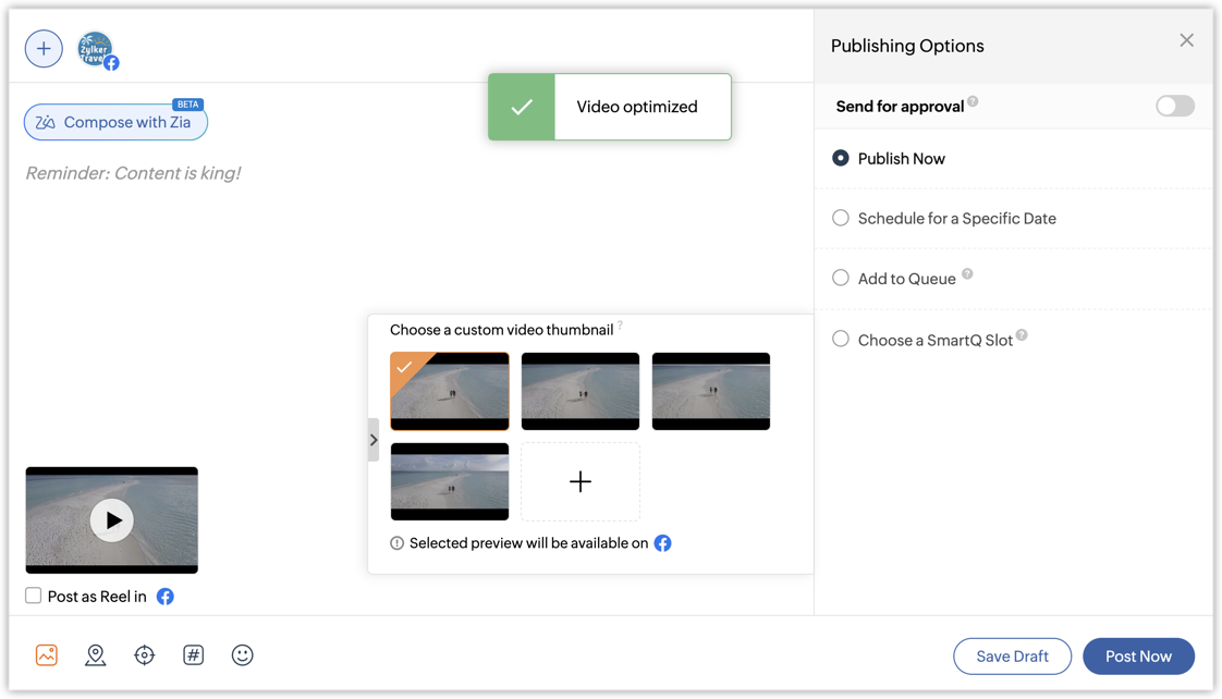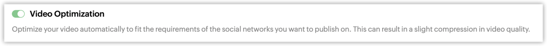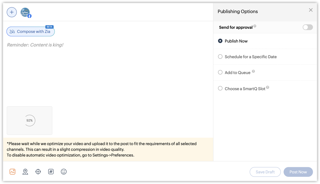 To address this delay in time, and to make it easier for you to make the same video compatible for multiple platforms, Zoho Social has the Video optimization feature in the compose window. Video optimization is the process of making some adjustments and enhancements to your video while still ensuring that it doesn't significantly affect the quality and making it compatible to post to all social media channels. This also reduces the risk of having video playback issues and provides your audience with a smooth viewing experience. Zoho Social takes care of this entire process for you, without you having to worry about the tedious work.