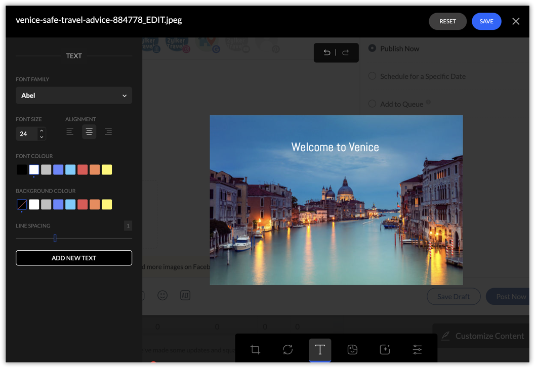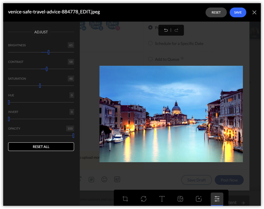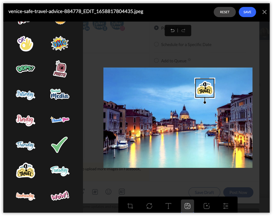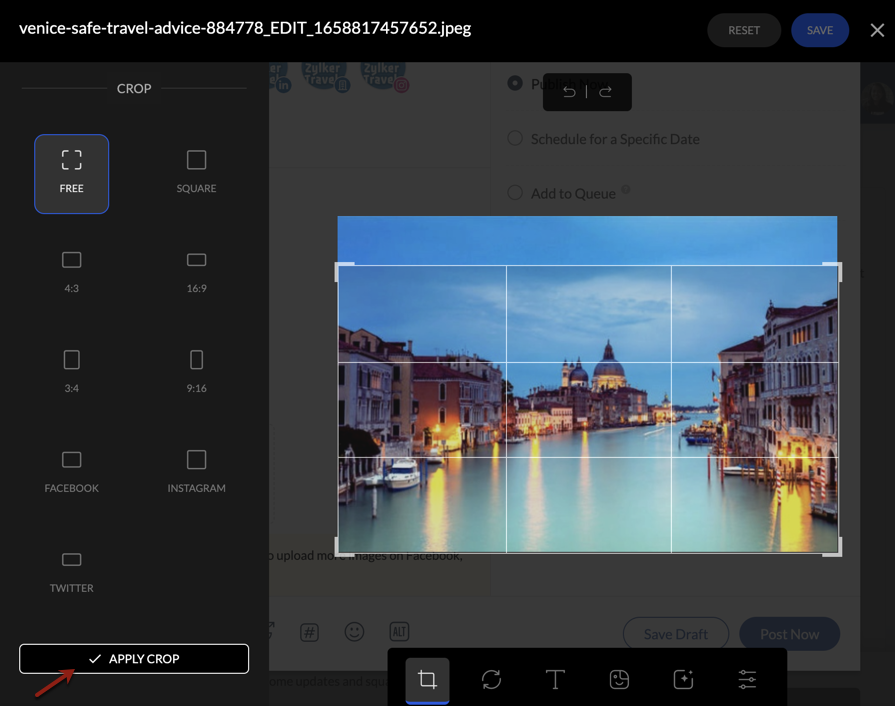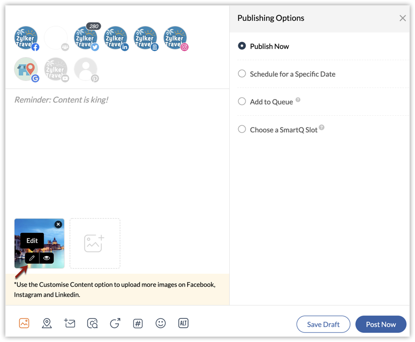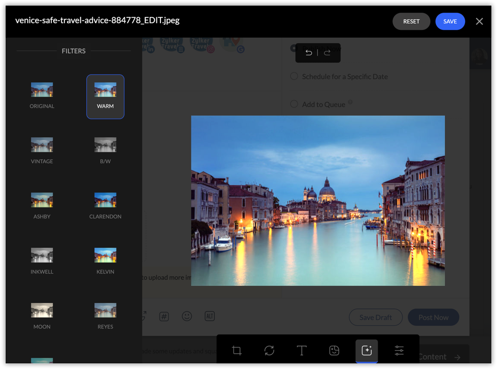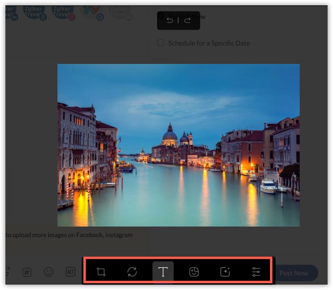 Editing is now available on the go in Zoho Social. You can now edit your images before posting them to any of the linked social media channels like Facebook, Instagram, Twitter, Google My Business, Pinterest, and LinkedIn, without having to leave Zoho Social.