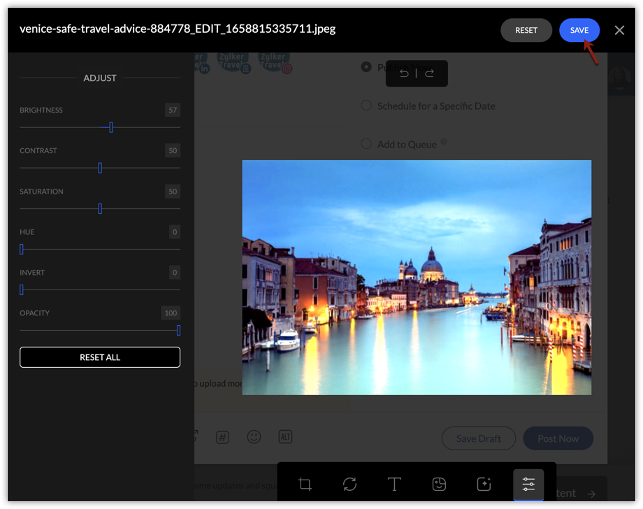 - Click the Adjust icon to enhance your image. You can vary the factors by dragging the cursor along the horizontal line. Click Reset All to set the factors back to their initial numbers.