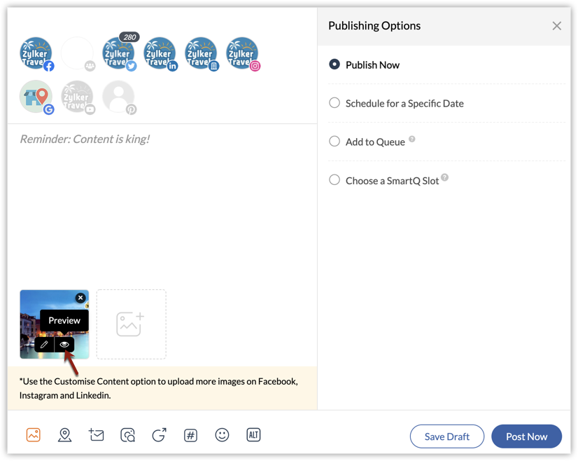 - The final edited image can be previewed by clicking on Preview while hovering over the image, before publishing the post.