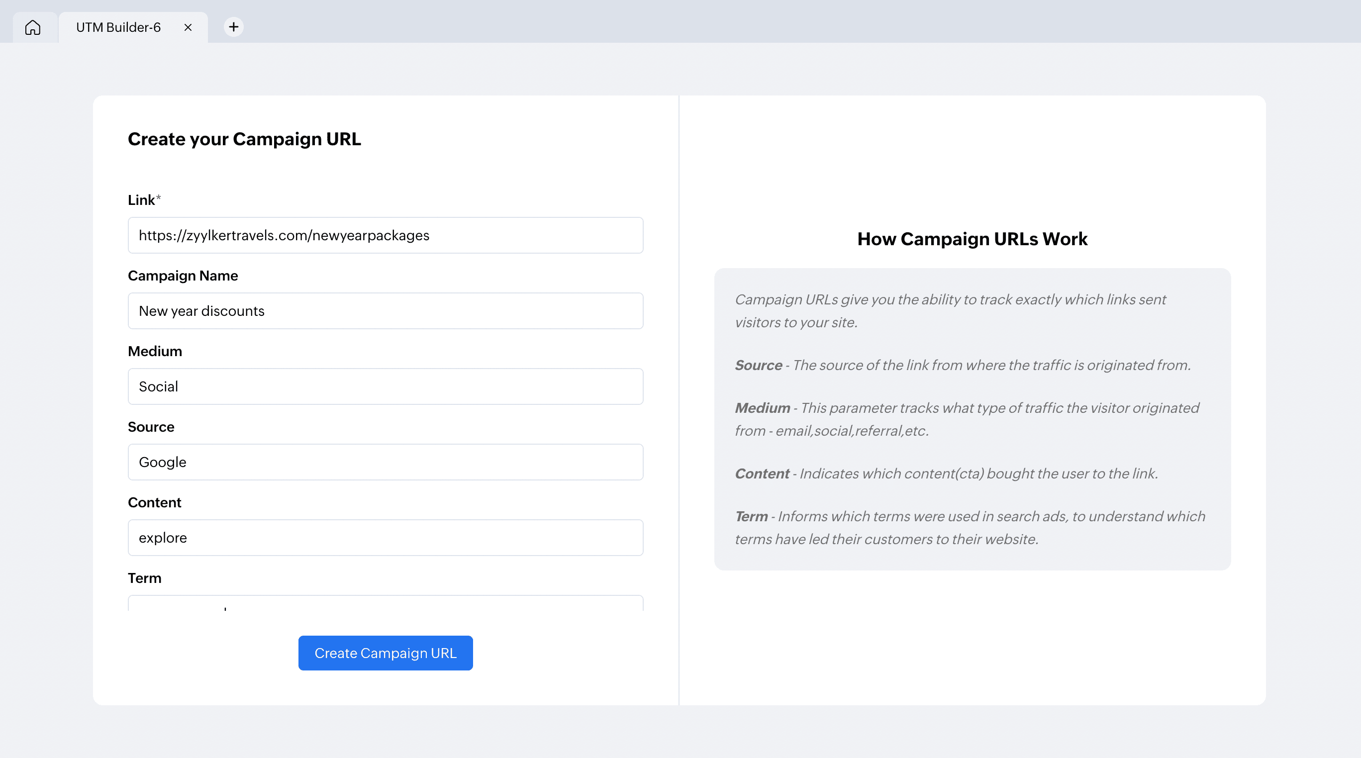 The Campaign URL Builder tool is used to create custom URLs specific to your campaigns. These URLs contain tracking parameters that will help to identify where the traffic to your webpage is coming from by understanding keywords, source, medium, name of the campaign, and others. Analyzing these parameters in detail will help you know which medium is generating better engagement, so that you can allocate your marketing budget and resources accordingly. You can use different links for your ad variants, emails, or landing pages, and then decide which one to continue based on the performance. Assessing this will help you optimize your marketing strategies and reduce your spend.