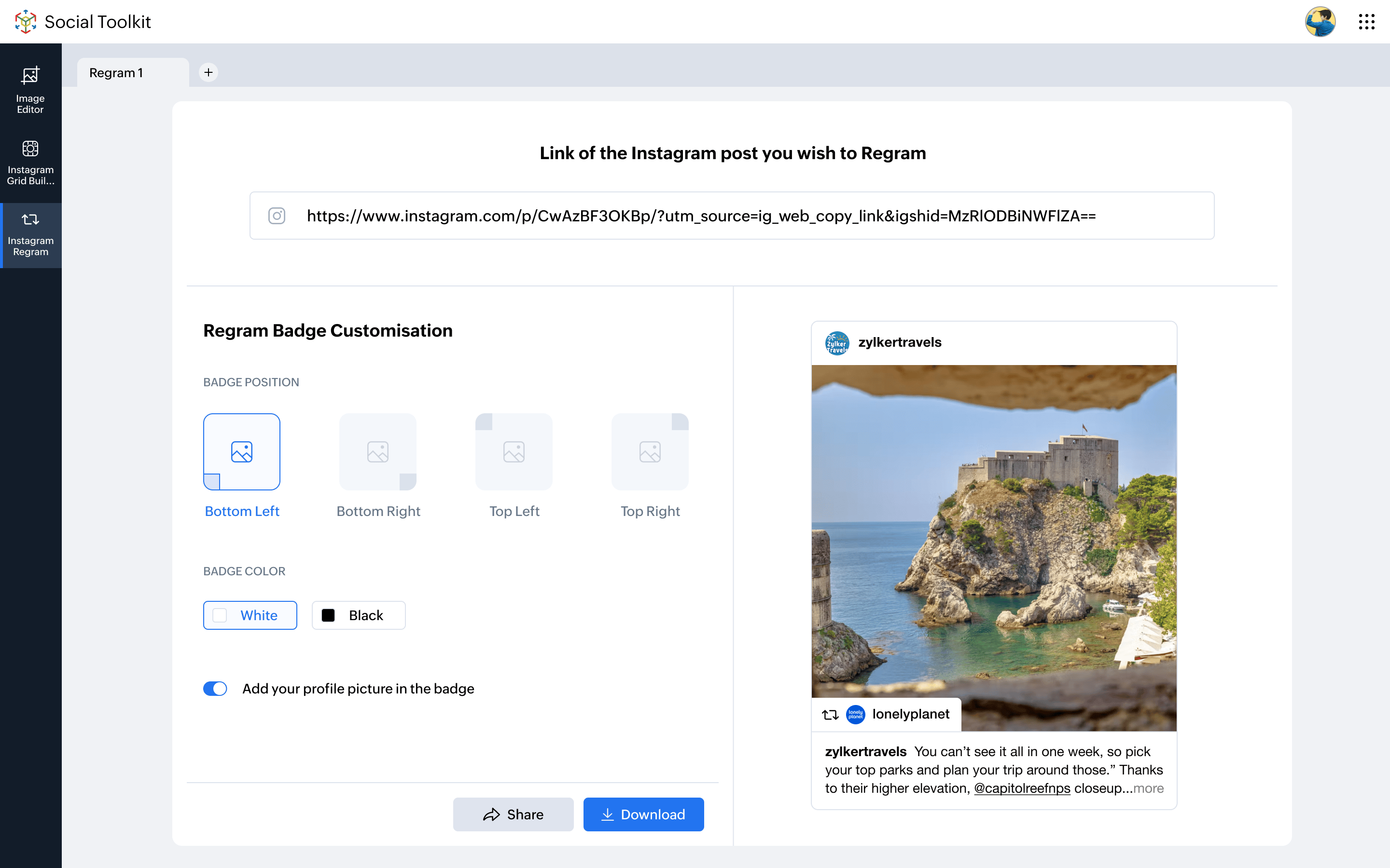 4. Customize where you want the Regram badge to appear on your post by choosing a badge position from bottom left, bottom right, top left, or top right.