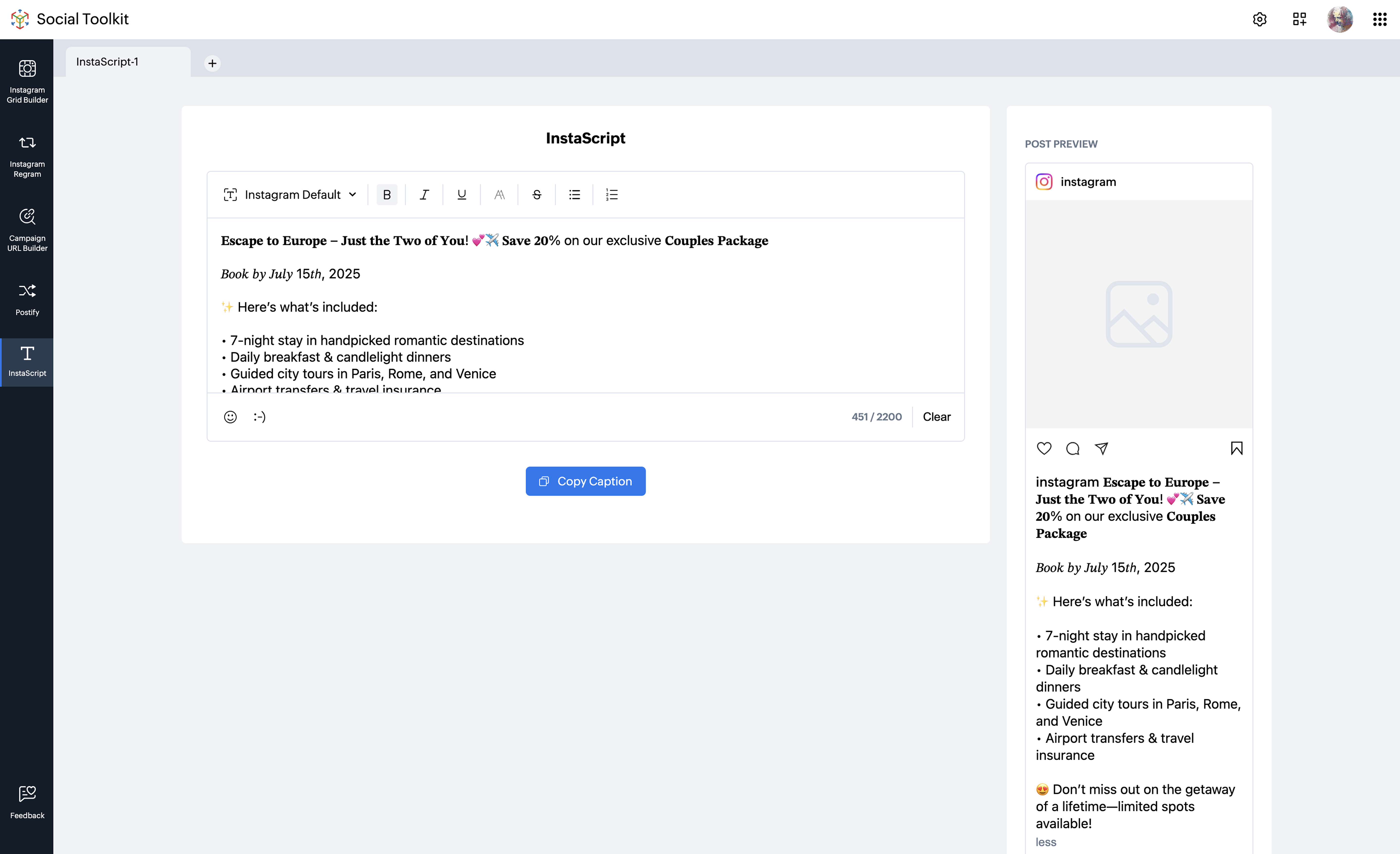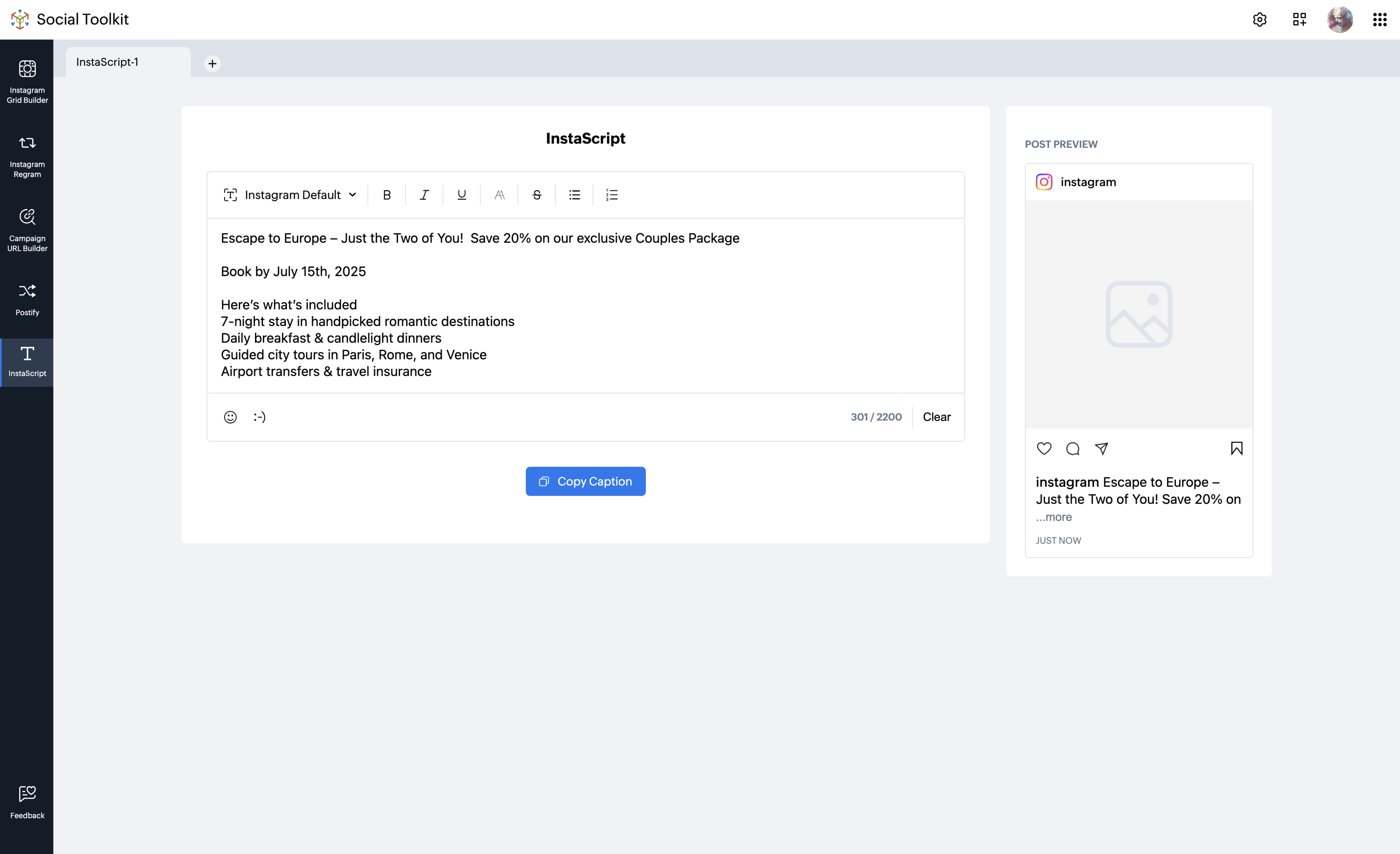 6.  After finalizing your caption, click Copy Caption and your caption is ready to be posted on Instagram.