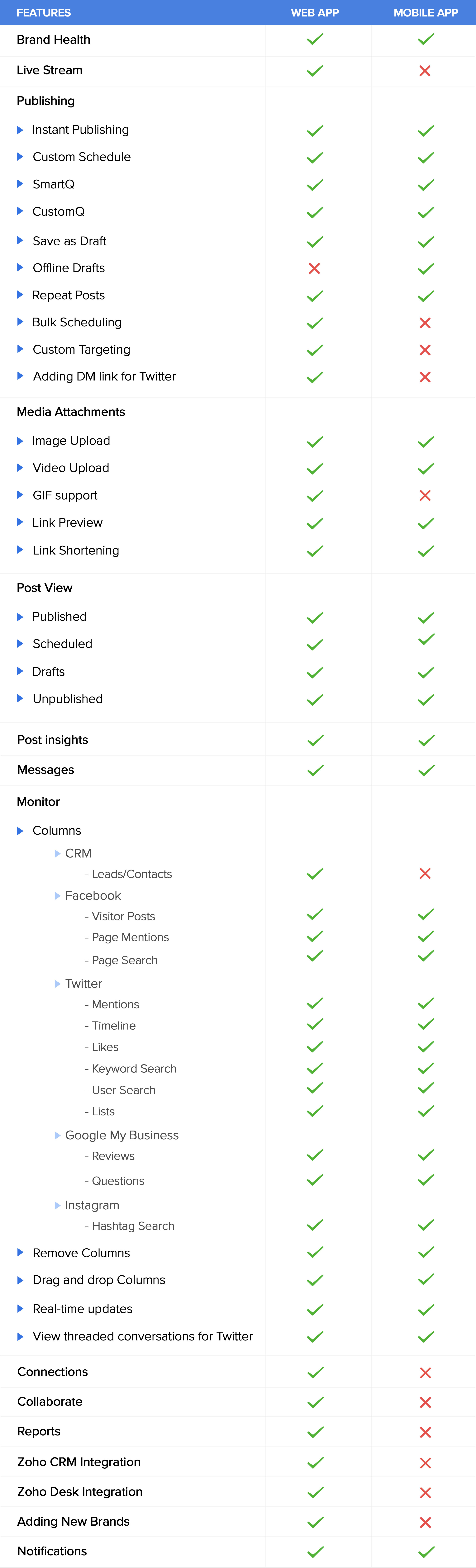 We want you to stay connected to all things social and make the most of your social media marketing efforts. This is why we have created a table that differentiates the features present on the web from that of the mobile app. Take a look to understand what feature works best for the web and the mobile app, and how this can help your business:
