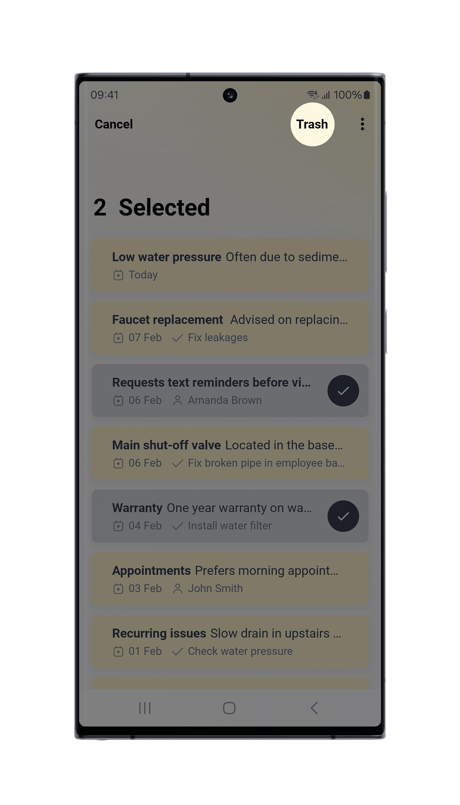 2. From the list of notes, long press on the note that needs to be trashed. You can select more than one note.