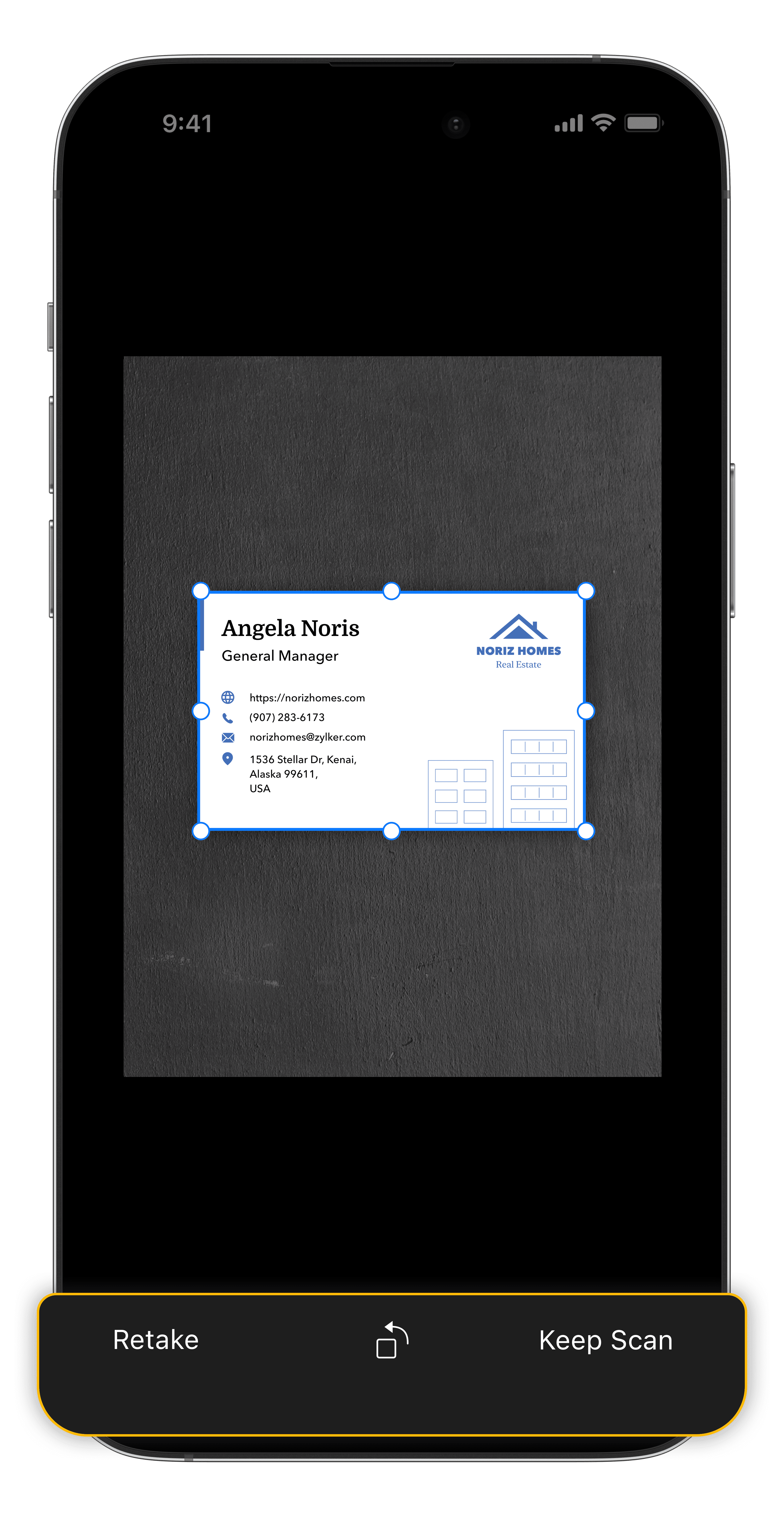 1. Once the card image is captured, tap Keep Scan to add the card as a contact or tap Retake to scan again.