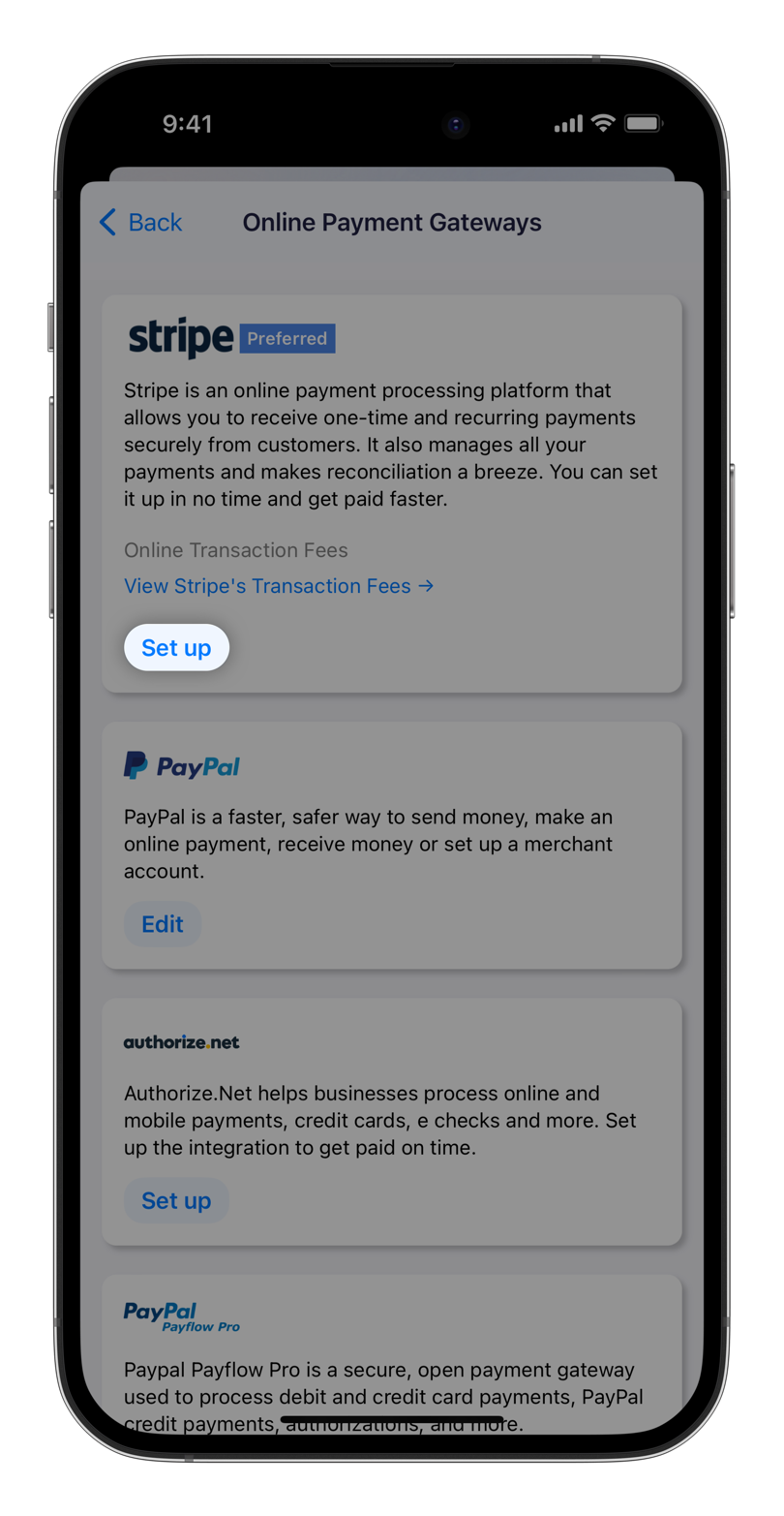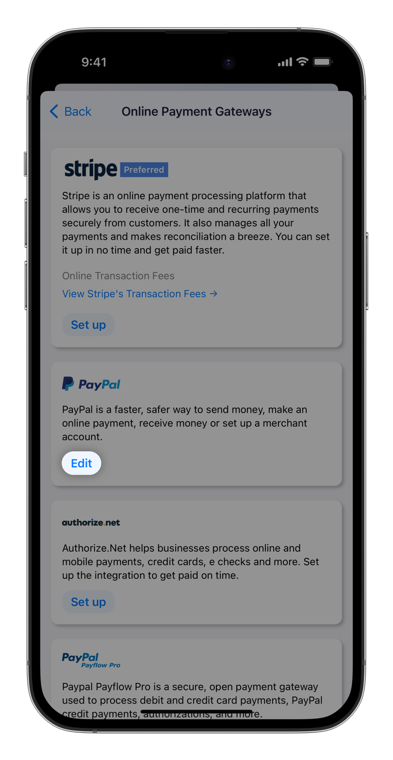 For Android: Click the three dots in the top-right corner of the homescreen and click Settings > Payment Gateway > Edit (below each gateway that is set up).