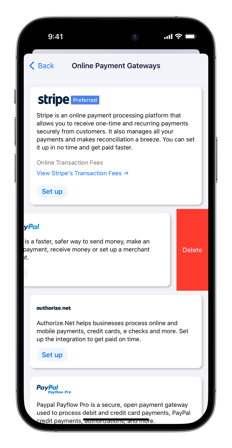 Swipe left on the configured payment gateway that needs to be removed and click Delete.
