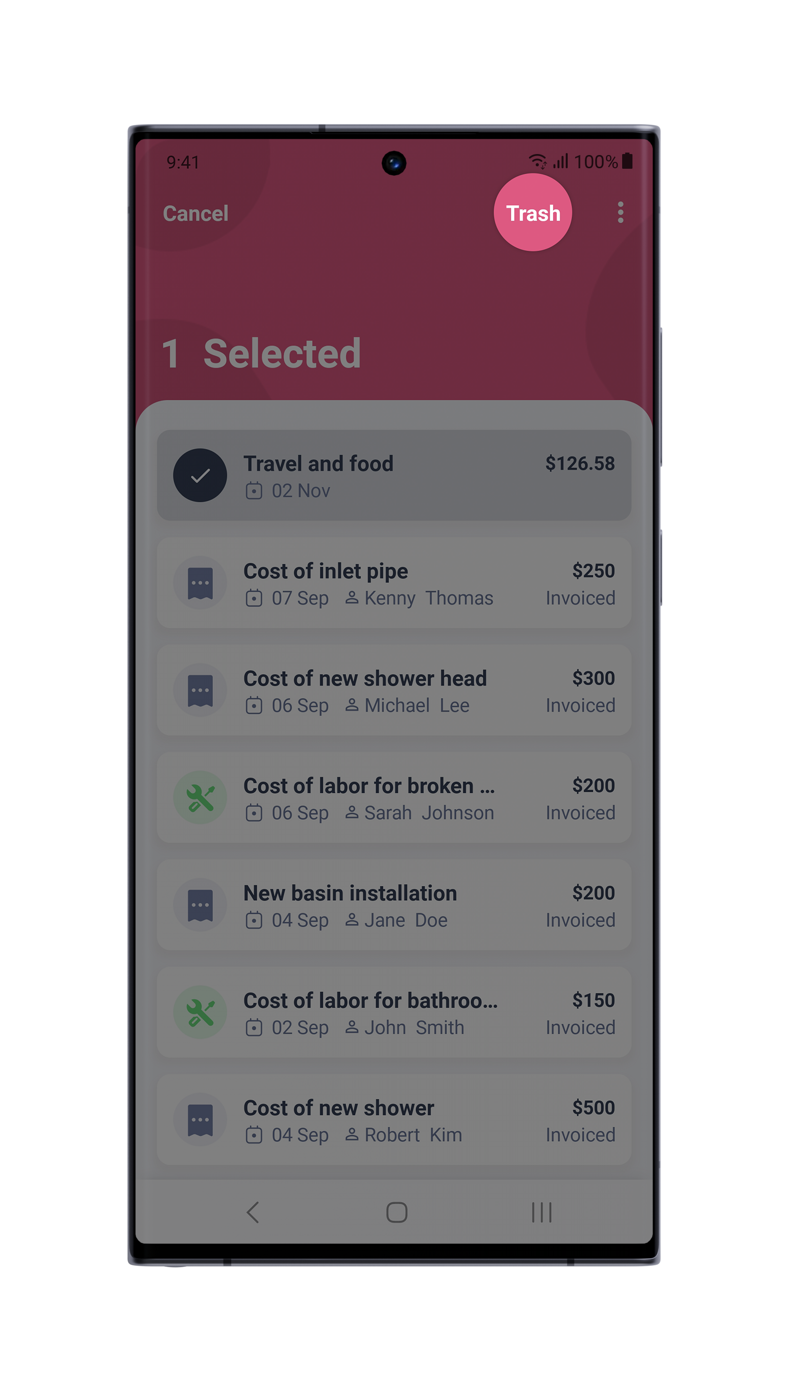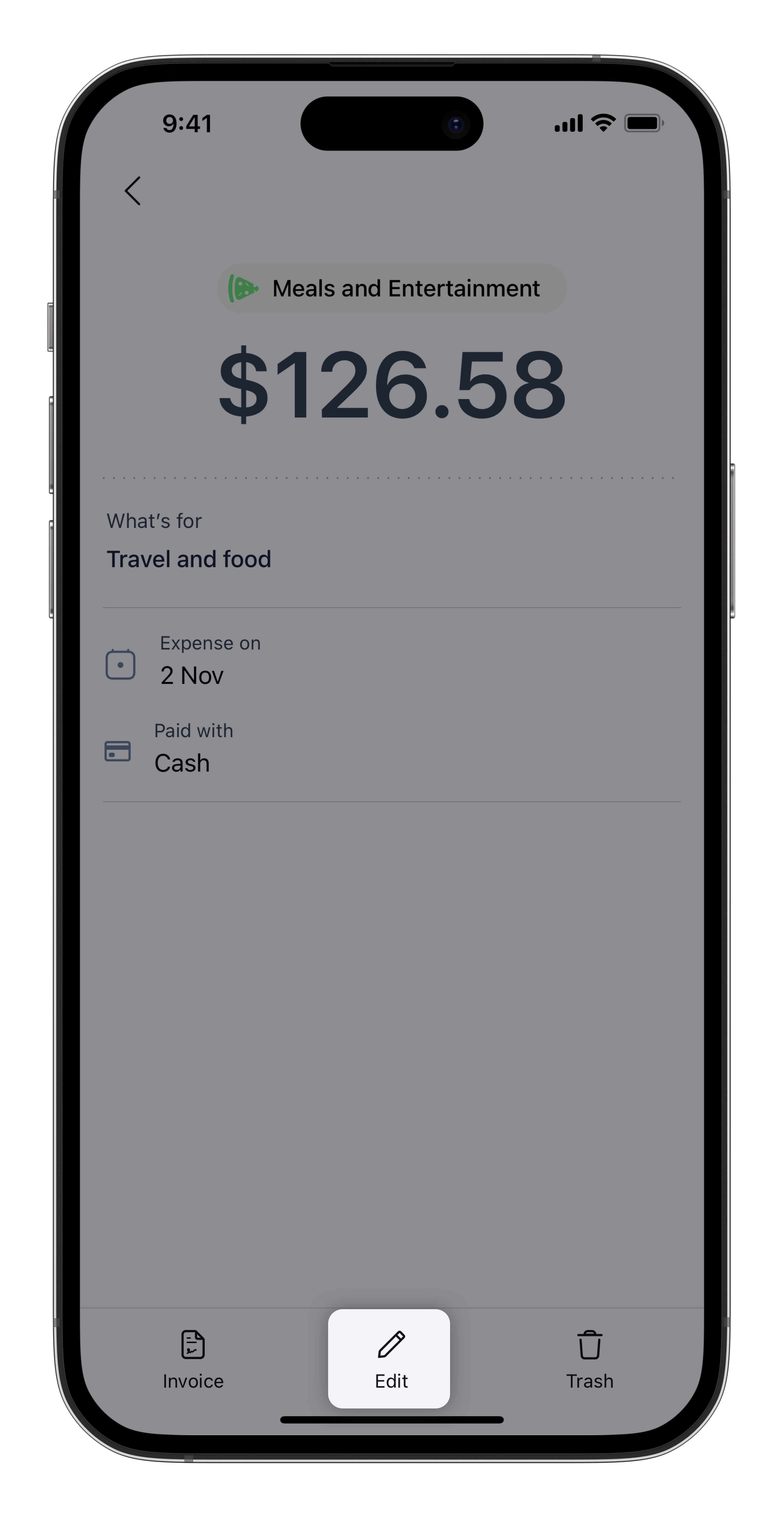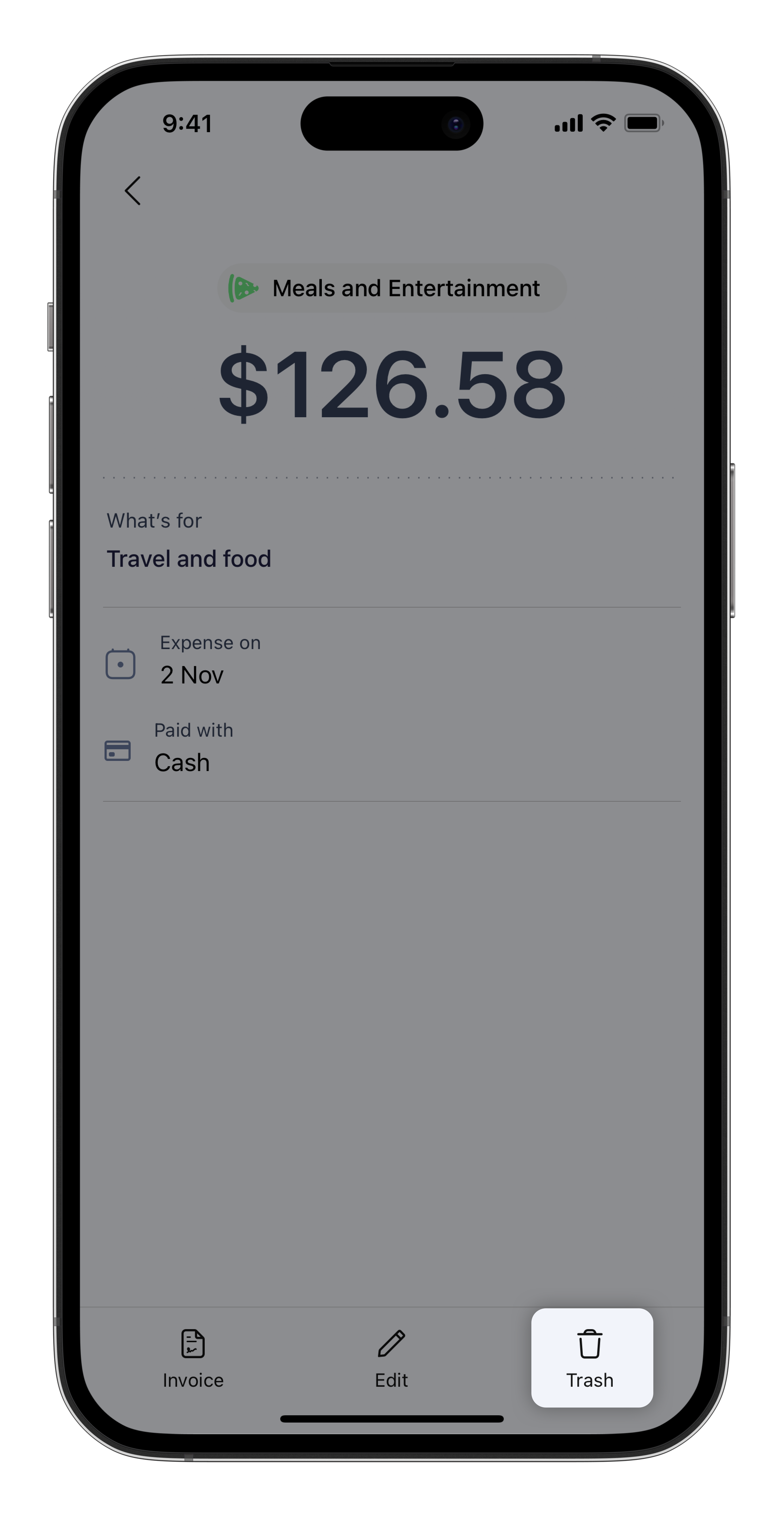 Press and hold the expense that needs to be deleted and click Trash at the top of the page.